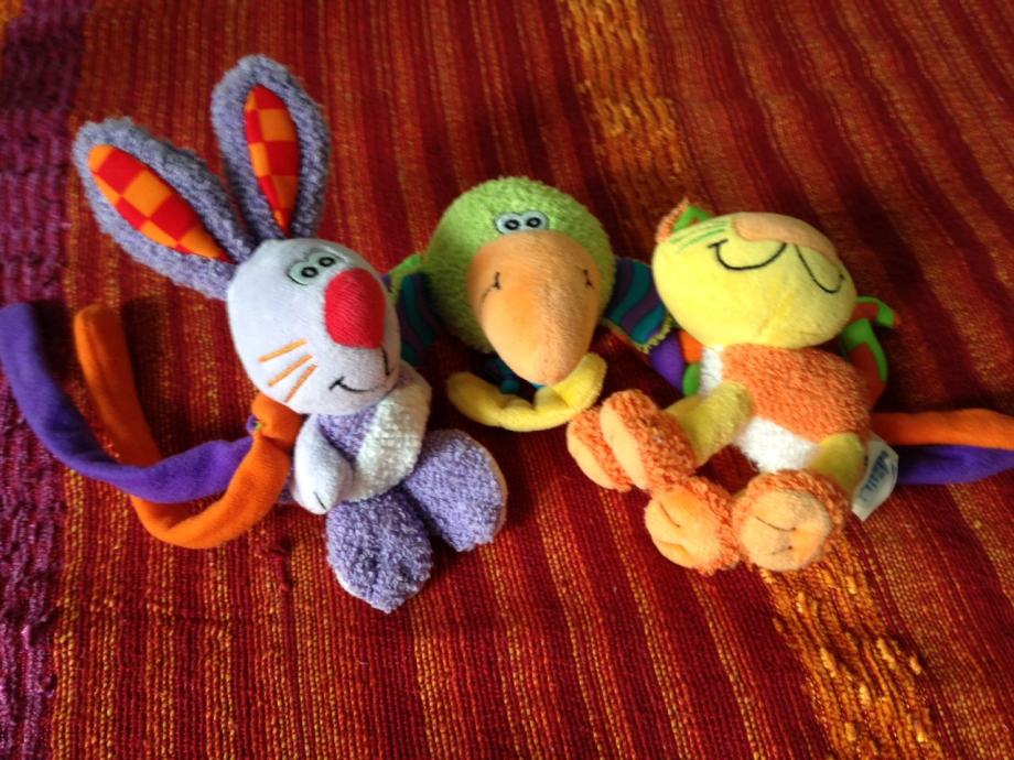 2. Igračka za dječja kolica - plišana trojka (zec, maca i ptičica). Periva u mašini. Cijena 20kn.