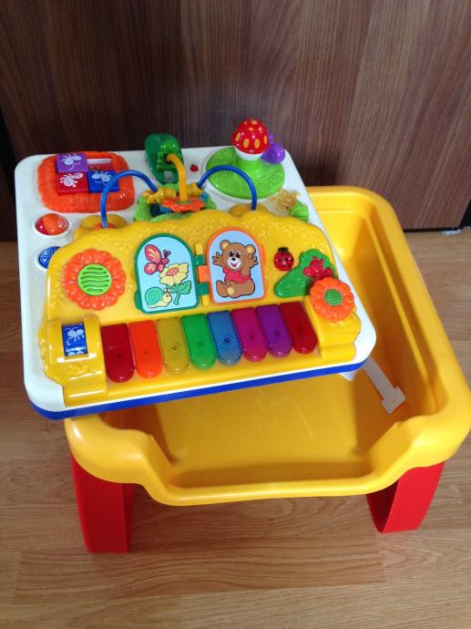 5. Chicco glazbeni didaktički stol za bebe od 6 do 36 mjeseci, posebno pogodan za djecu koja se uče stajati ili hodati. Sadrži postolje/spremnik za kocke, kocaka različitih boja i veličina, dvije široke noge, dvostranu didaktičku ploču, klaviru s različitim brzinama glazbe.