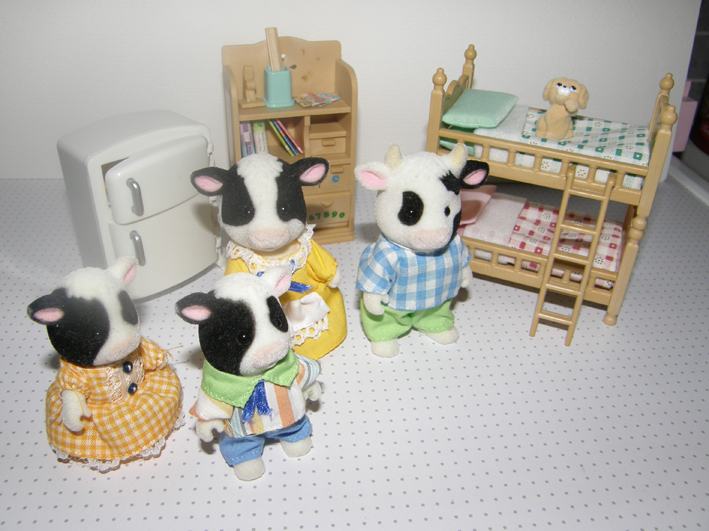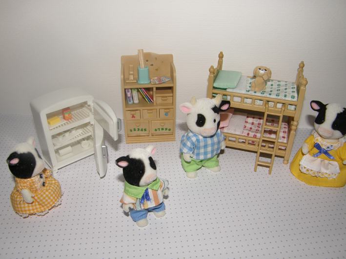 Ova igracka je kupljena u Engleskoj. Predstavlja obitelj kravica + jako dobro napravljen minijaturni namještaj (frižider s namirnicama, ormar s knjigama i ostalim, krevet na kat + male igračke). Kravice su veličine 6,5 - 9 cm. Sve je u jako dobrom stanju.
