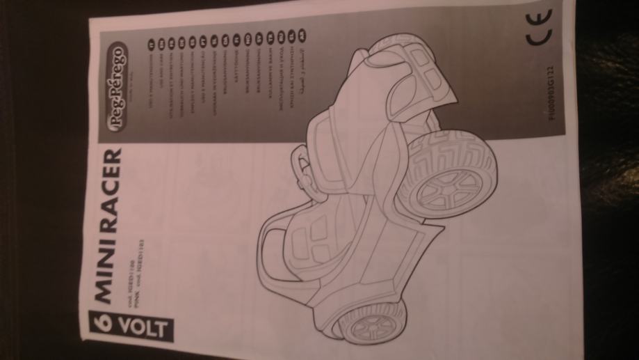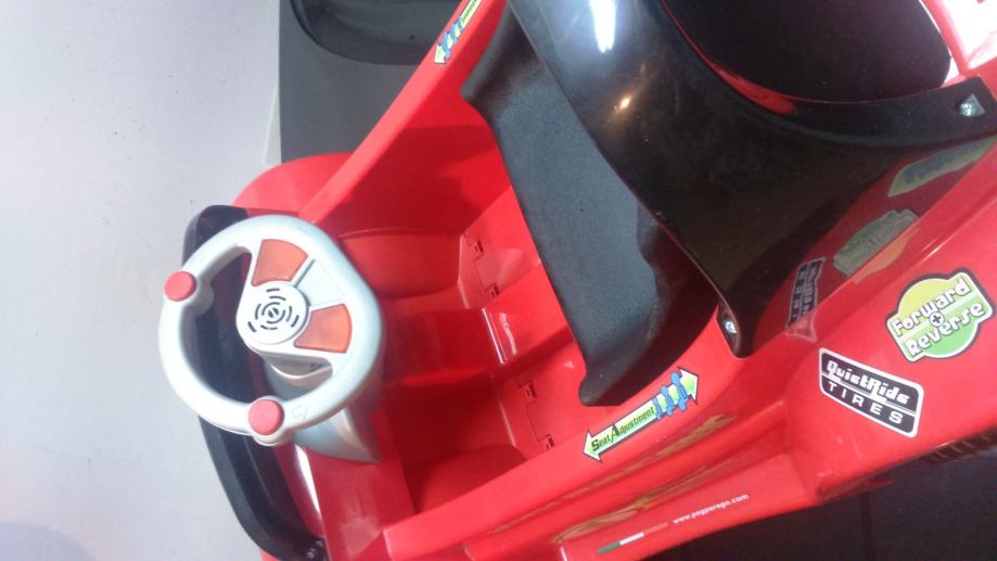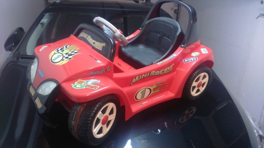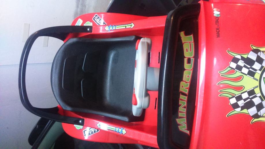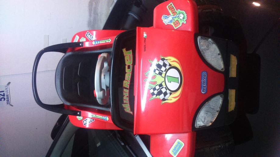 Prodajem malo korišteni mini auto Peg Perego MINI RACER na električni pogon. Pogodan za djecu stariju od dvije godine. Baterija snage od 6V te najveća brzina od 4 km/h. Baterija se brzo puni. Jedno punjenje izdrži oko 2h vožnje. Lagan za upravljanje, pomični volan sa zvučnim i svjetlosnim efektima, 1 brzina + vožnja unatrag, podesivo sjedalo, kotači dodatno pojačani gumenom trakom, odlična zabava za djecu već od 2 godine na dalje. Zbog pomičnog sjedala moguće ga je voziti do 5 godina. Dimenzije: 52x92cm uz visinu od 49cm.