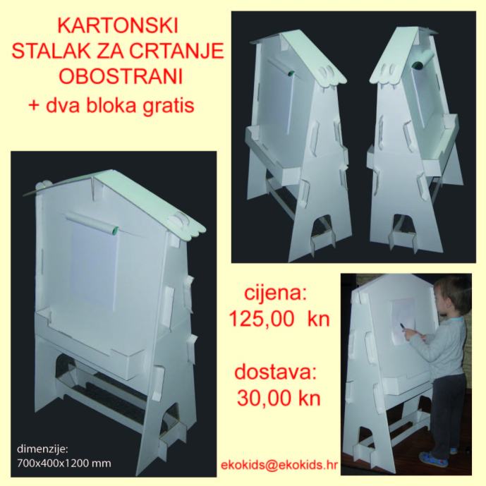 Stalak za crtanje napravljen je od čvrtog bijelog kartona. Sa obje strane se nalazi ladica i prostor u koji se postavi blok za crtanje, veličine od A3 (420mm) pa na manje. Uz stalak se dobiju dva bloka A4 gratis. Dostava 30,00 kn , ekokids@ekokids.hr