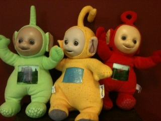 Teletubbies, mekani plisani. Zeleni i crveni su bolje ocuvani jer smo zutog obozavali. Ljubicasti trenutacno neznamo gdje je ali mozemo pronaci. Ovo su jedinstvene igracke za djecu koja gledaju teletubbies na televiziji s obzirom da se nemogu kupiti vise kod nas u ducani, Mi smo svoje narucili iz Amerike.