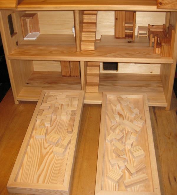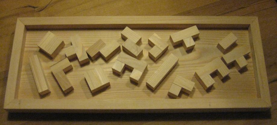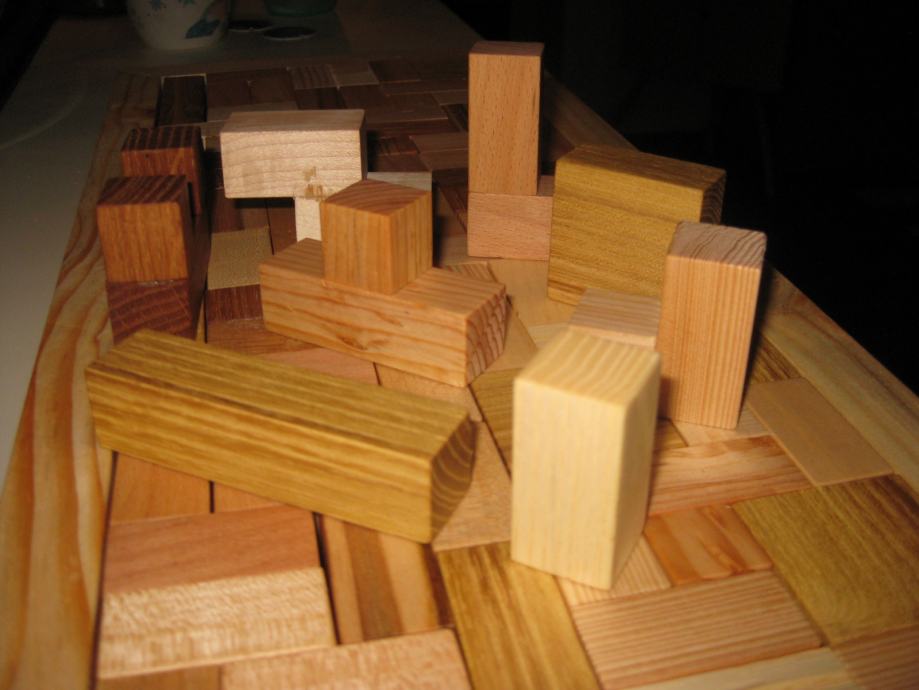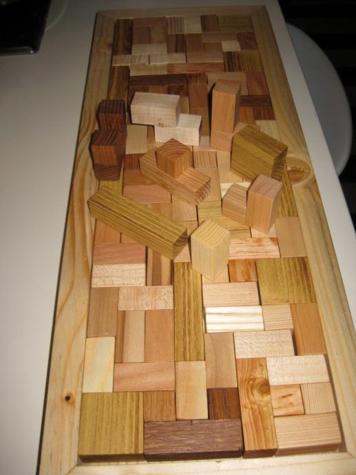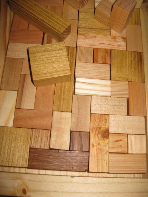 Materijal - bagrem, orah, trešnja, hrast, smreka, ariš, javor, bukva i jasen. Svaki oblik je od druge vrste drva. Premazano lanenim uljem.