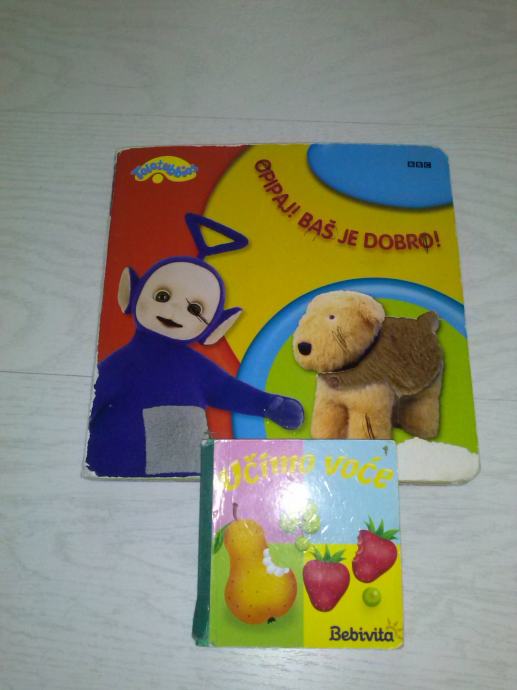 -2 knjige na poklon-Bebivita-učimo voće i Teletubbies-i (knjiga je napravljena da dijete ima i taktilni doživljaj kad dodiruje stvari koje su nacrtane, npr.ovca je nacrtana ali se može opipati njeno runo koje je naljepljeno).slika dolje