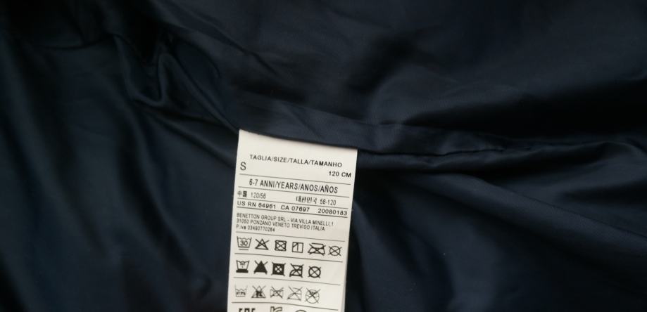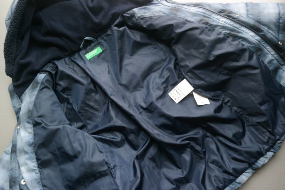 Zimska jaknica za dečke, Benetton, veličina 120 tj. S (6 do 7 godina), komotniji model, mekana i lagana, kopčanje cif i drukeri, jednom nošena, aposlutno kao nova