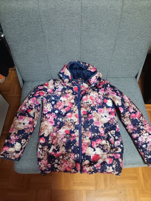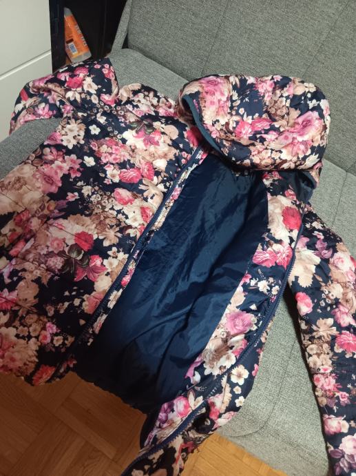 Prodajem dječju zimsku jaknu s cvjetnim uzorkom. Jakna je tamnoplave boje s ružičastim i krem cvjetovima po cijeloj površini. Ima kapuljaču, zip zatvarač i bočne džepove. Postava je tamnoplava.jaknu može nositi i netko sitnice građe tko nosi veličinu xs ili s.