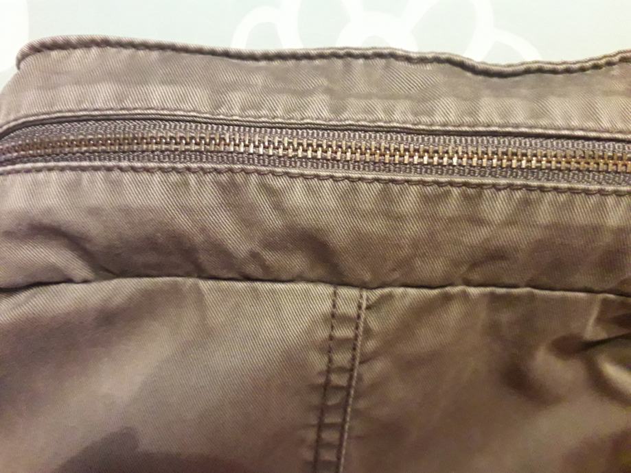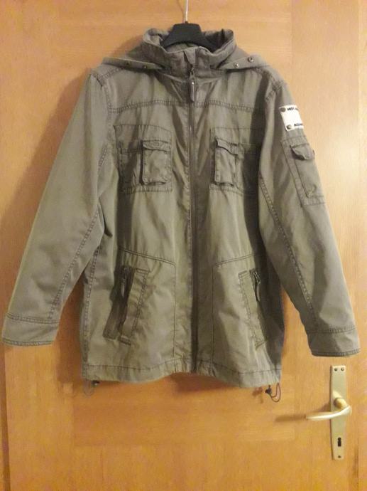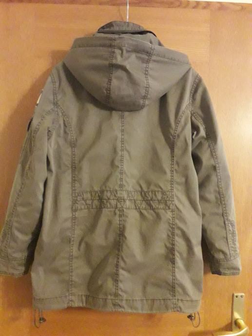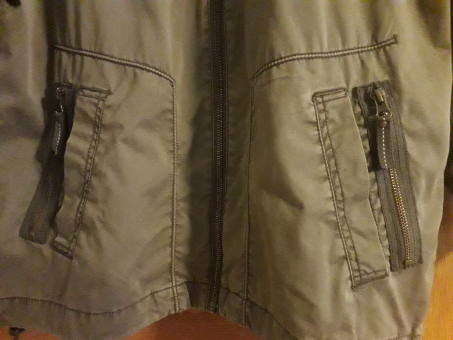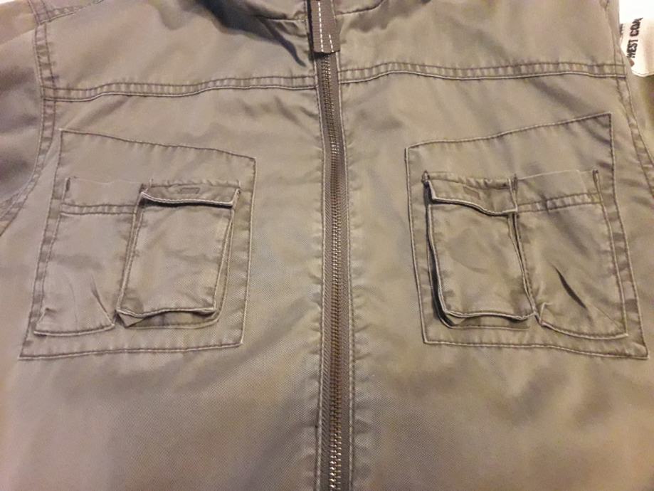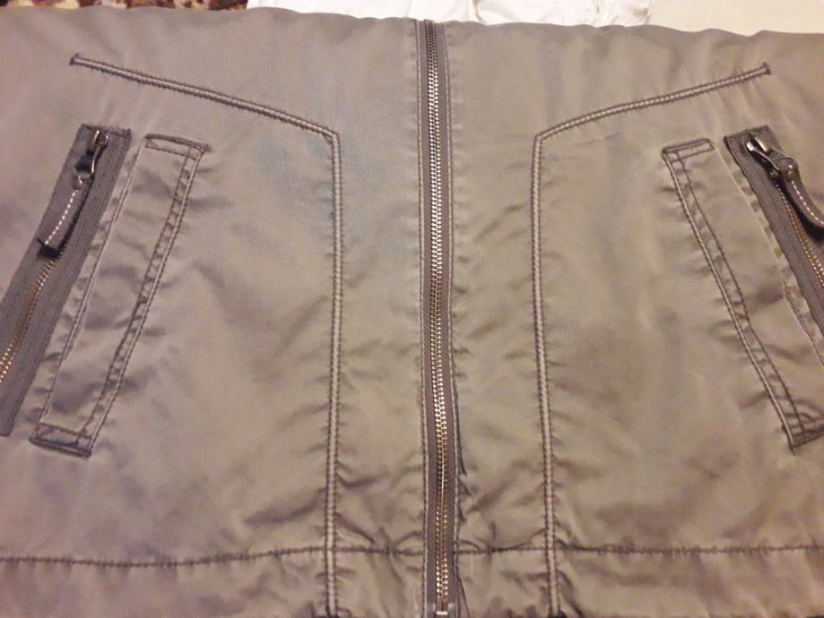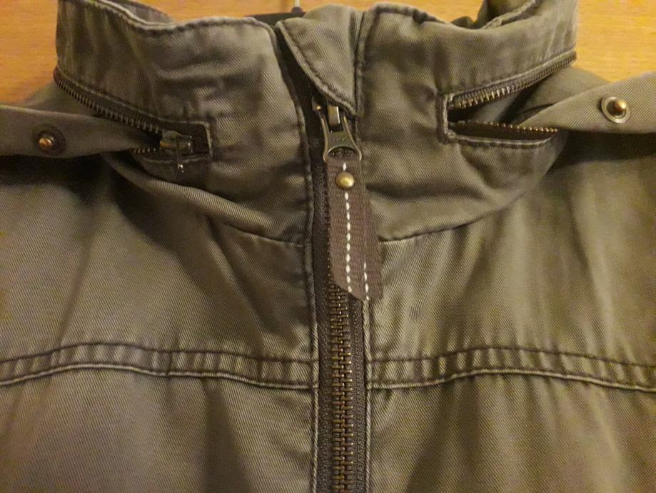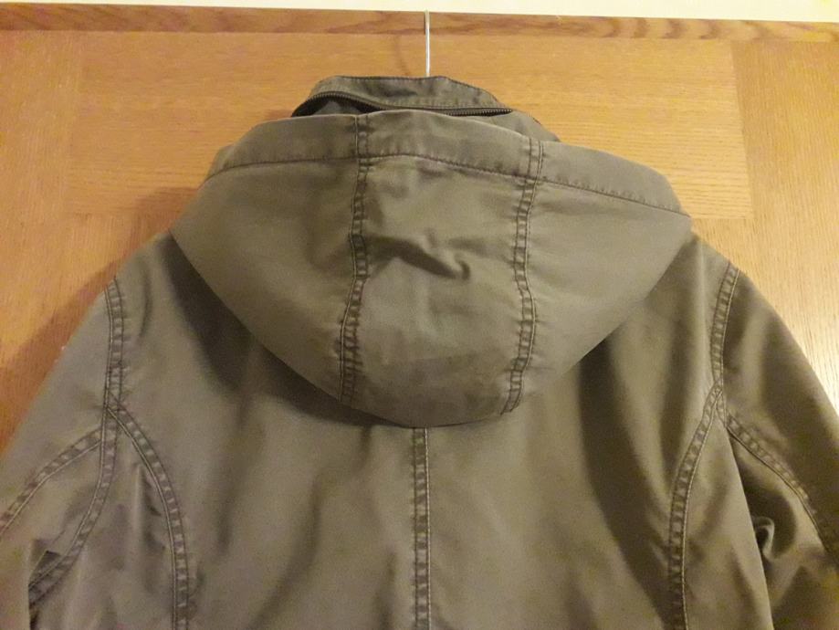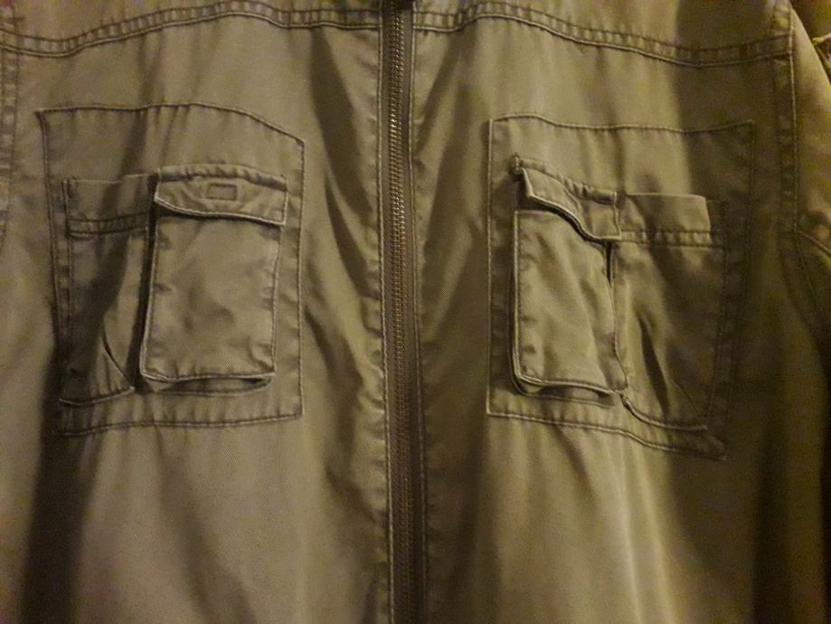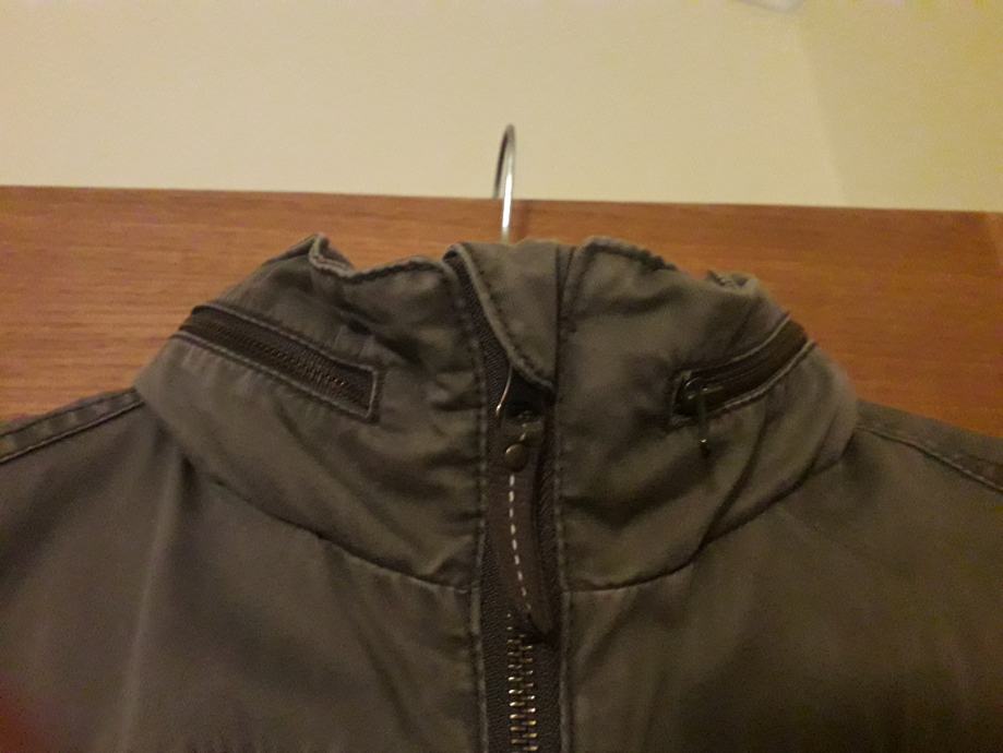 Jakna je sivo smeđa, kopcanje ispravno, bez mrlja i ostecenja. Ima unutarnji džep za mobitel. Kapuljaca se moze zakopcati unutar ovratnika.