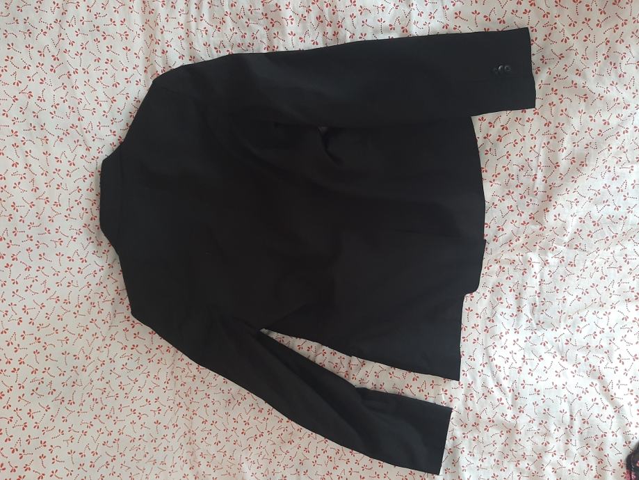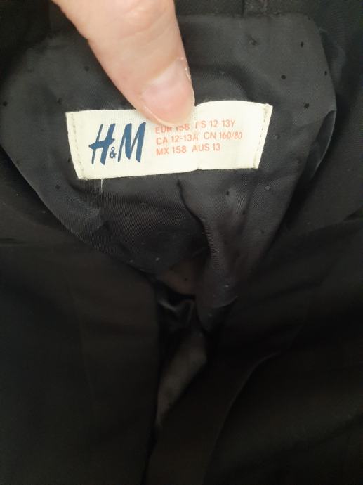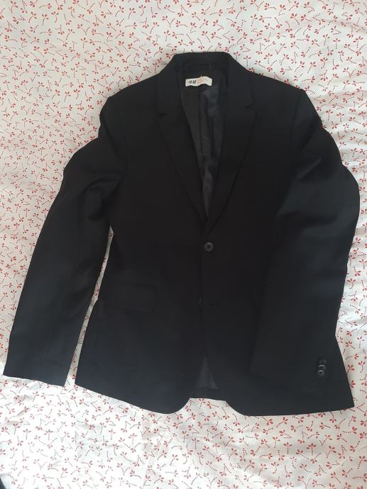 Dječji svečani sako crne boje H&M. Nošen svega par puta. Bez oštećenja. Vel. 158. Dužina od vrha ramena do dolje 62cm, širina od pazuha do pazuha 45cm, dužina rukava od pazuha do dolje 42cm