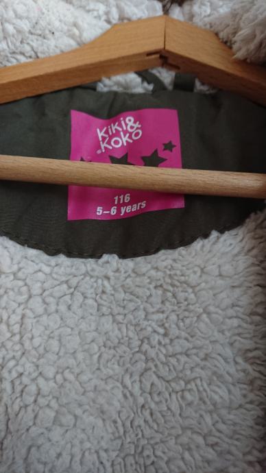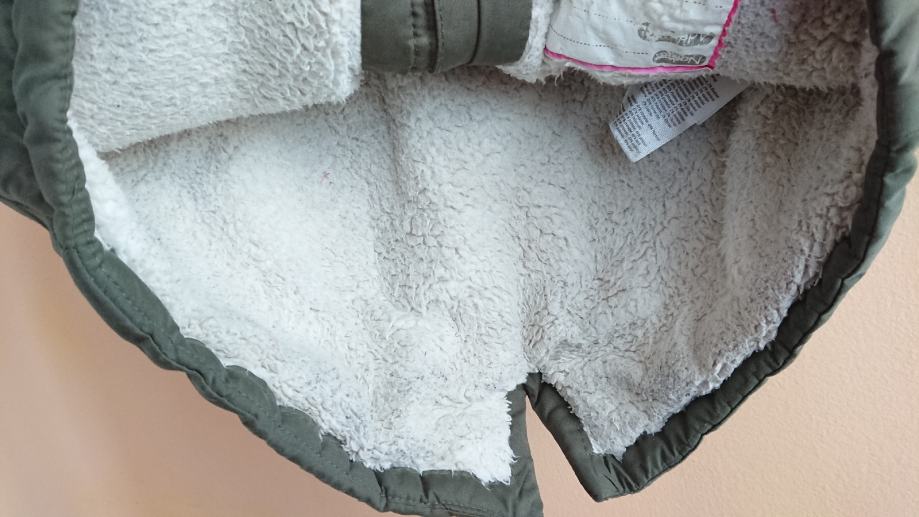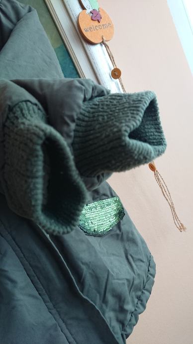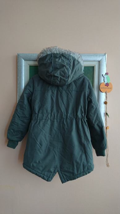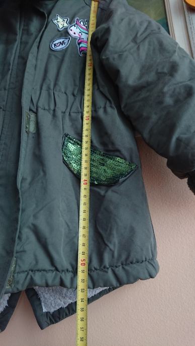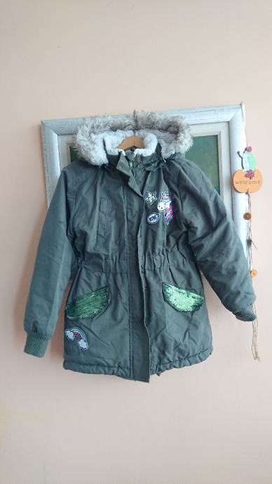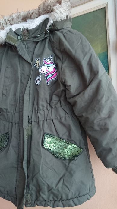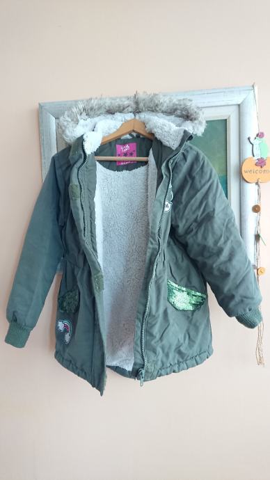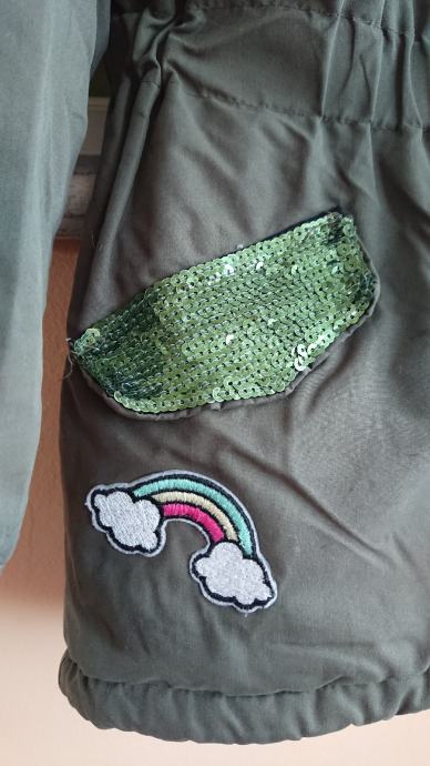 Jaknica br. 110 / 116 za djevojčice, pretežno tamnozelene boje, sa svjetlucavim detaljima i veselim slikicama (duga, jednorog..), sa dva džepa naprijed, kopčanje na cif, ima kapuljaču koja se može skinuti, suženi rukavi da je toplije za rukice, topla, mekana i udobna, nošena, stanje vidljivo na slikama.