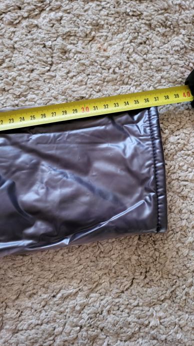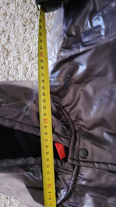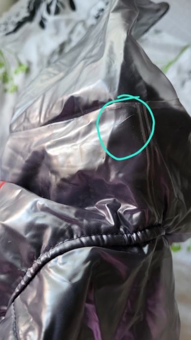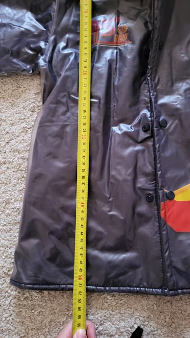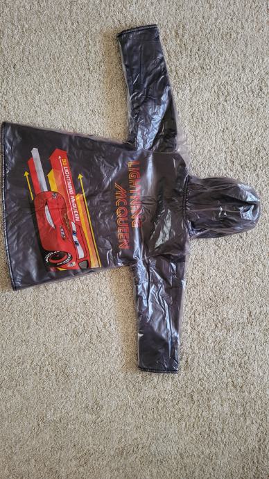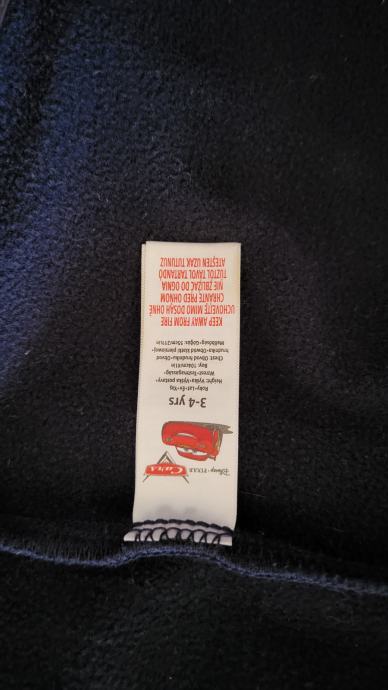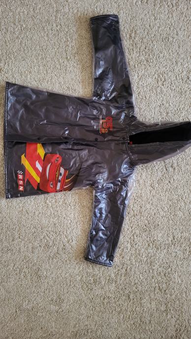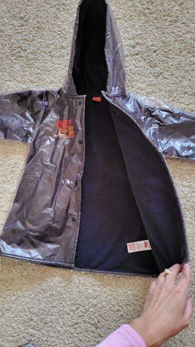 Super kabanica, izvana je nepropusan proziran materijal na kojem je s prednje i straznje strane otisnut juric, iznutra je flis pa je topla. Kopcanje na trukere, ima kapuljacu, pise broj 3-4, ali vise je za 4 godine. Moj sin dva puta obukao kad je bio 116. Duzina 52cm. Sad primjetila gotovo neprimjetnu porezotinu na gornjem materijalu kod ramena (oznacila sam na slici). Ramena 30cm, ispod pazuha 37, duzina rukava 37cm