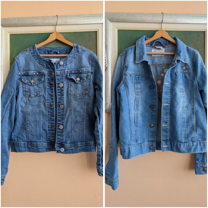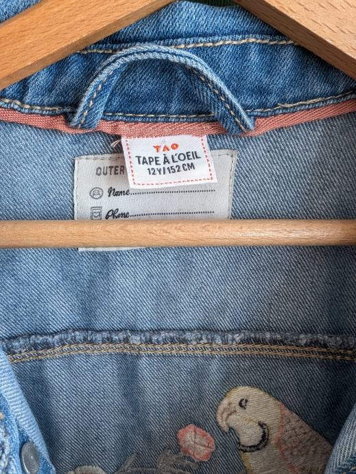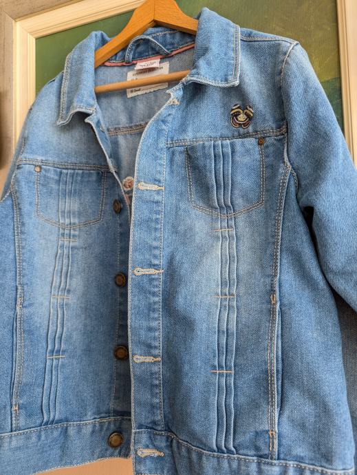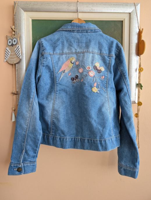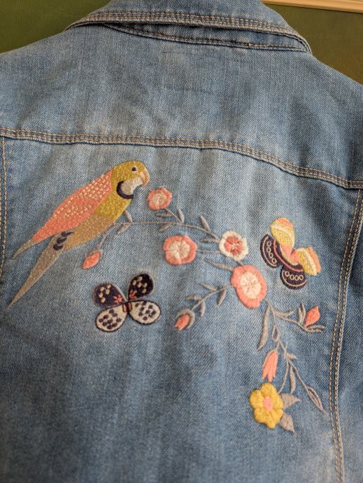 Traper jakna br. 152 za djevojčice, lot od dvije jaknice iste veličine, 1 + 1 gratis, jedna ima razne svjetlucave detalje, a na drugoj su izvezeni motivi - papiga, leptiri, cvijeće.