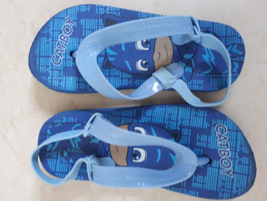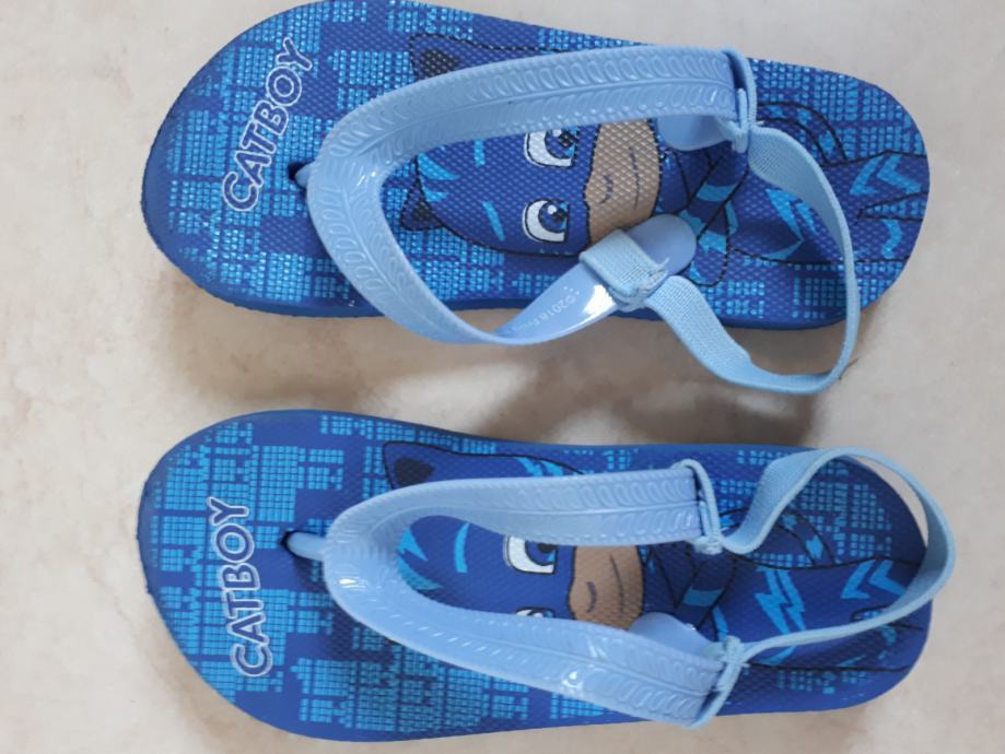 Dječje japanke sa gumicom oko pete. Veličina 25. Uistinu očuvane jer su nošene nekoliko puta. PJ Masks crtić. Lik Catboy.