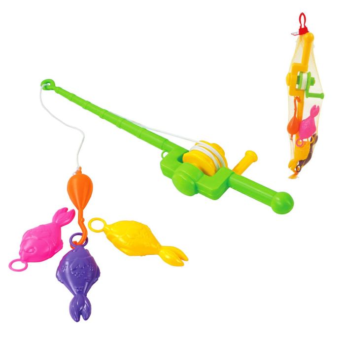 U setu: 1x štap za pecanje (50 cm) s užetom i udicom, 3x raznobojne ribice (15 cm).