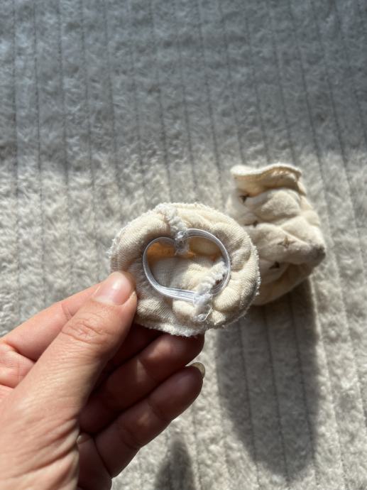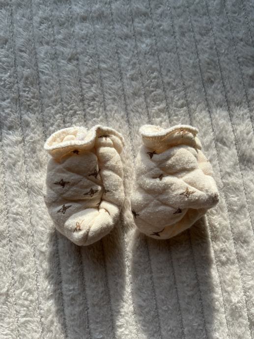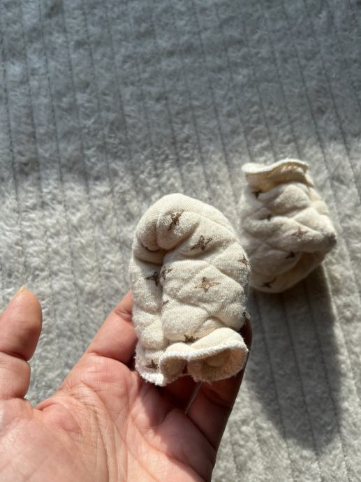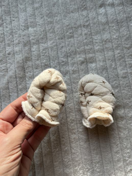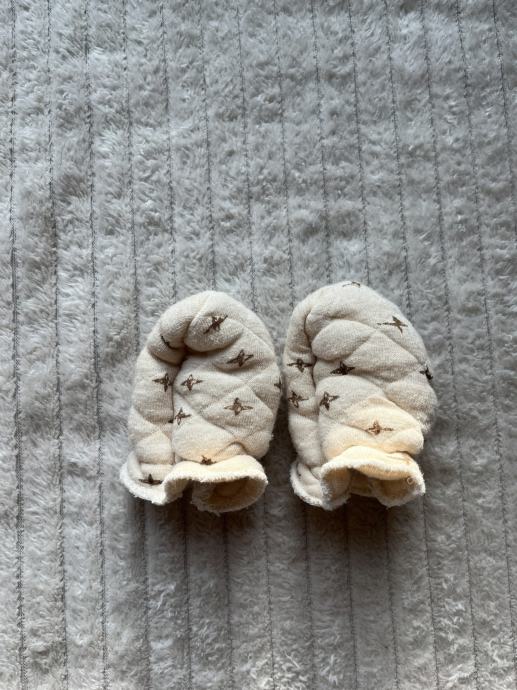 Krem mekane rukavice, kupljene pod oznakom za novorođenče. Rekla bih da bi stale na ruku do možda godine dana. Samo oprane.