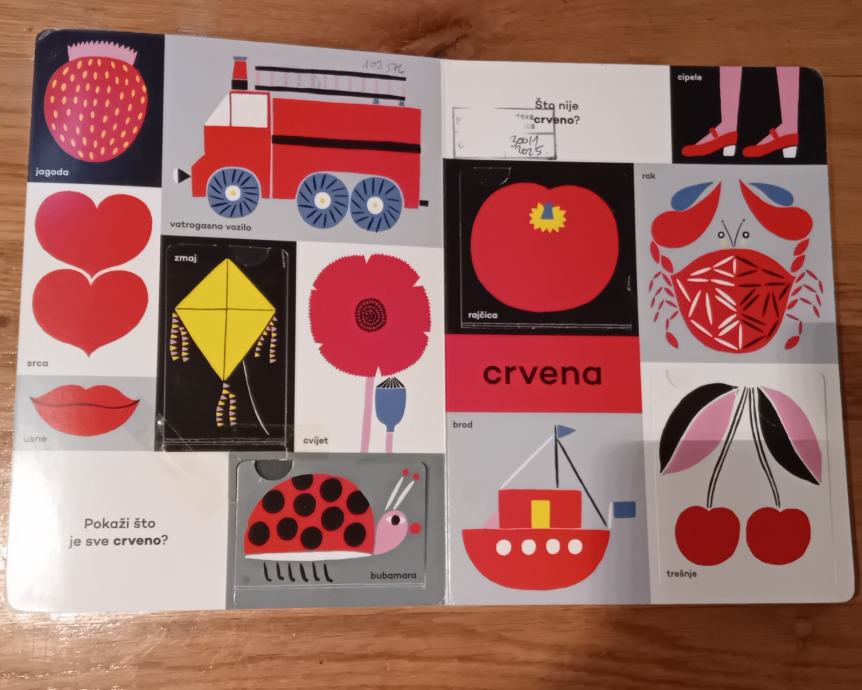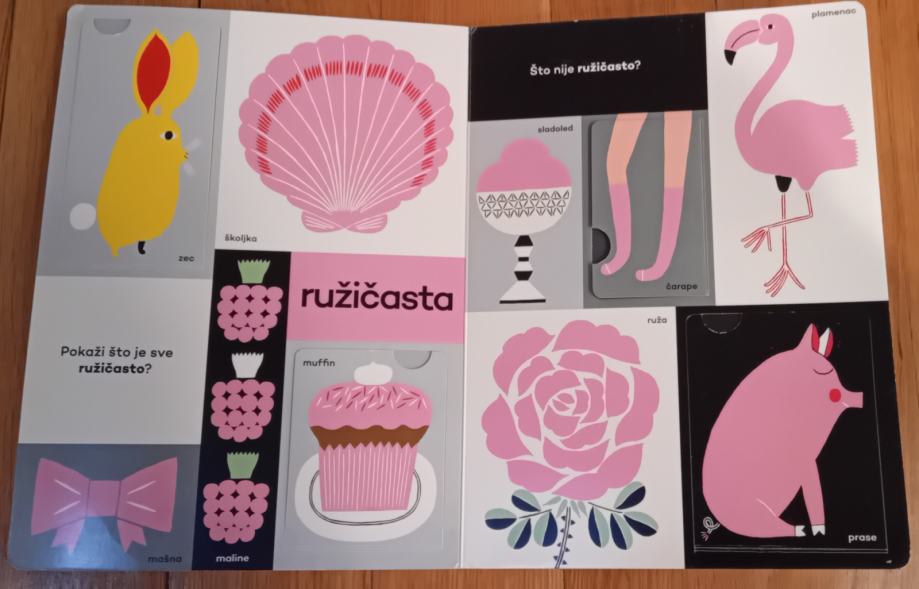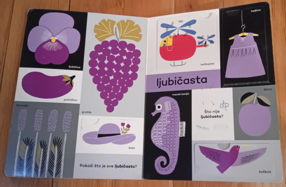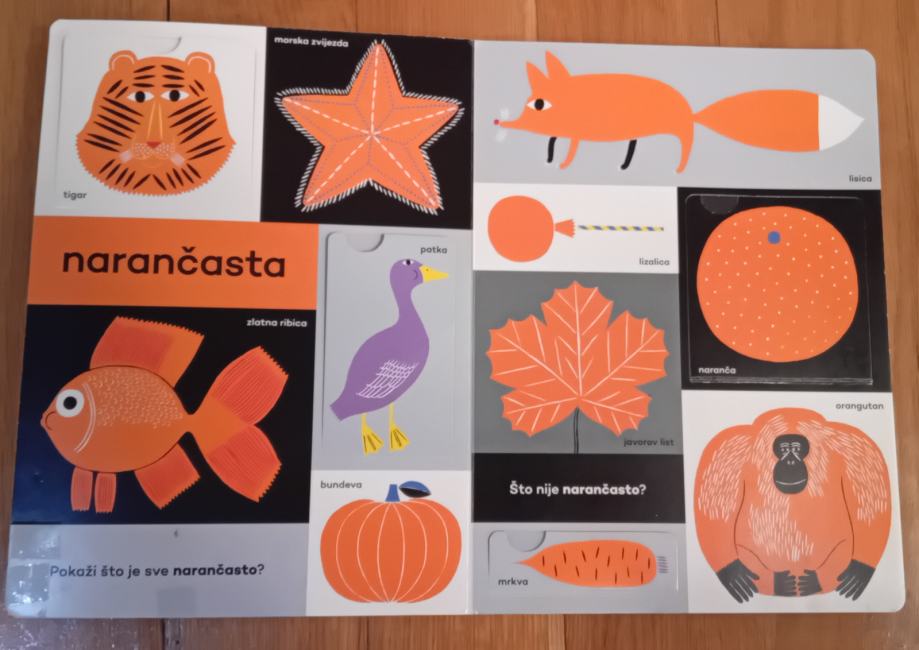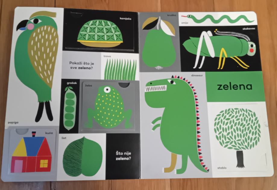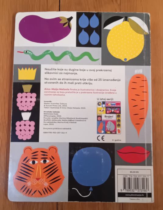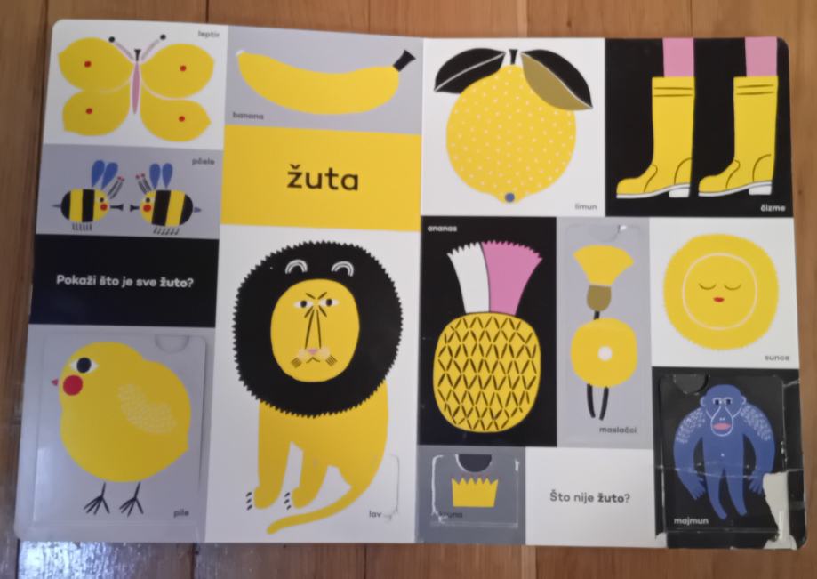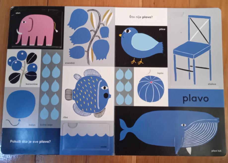 Slikovnica za najmlađe. Autorica je ilustratorica i dizajnerica (što je vidljivo već na prvi pogled), a svoje zanimanje za boju pretočila je u ilustracije izrađene u raznim tehnikama. Ova vizualno privlačna slikovnica sadrži "prozorčiće" s iznenađenjima i malim zadacima, na svakoj stranici. Na vrlo zanimljiv i zabavan način najmlađi će se upoznati s bojama.