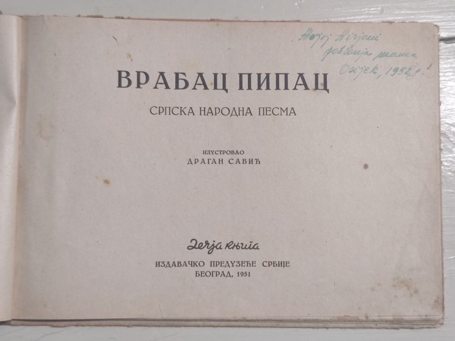 1. Vrabac Pipac, srpska narodna pjesma, izdavač: Dečja knjiga, Beograd, 1951.g., ilustrirao Dragan Savić, tvrde korice, 24 str. u boji, na ćirilici, sačuvano.