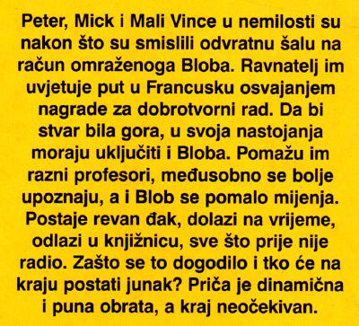 Peter, Mick i Mali Vince nerazdvojni su školski prijatelji. Nakon neslane šale na račun omraženoga Bloba, dječaka kojeg u školi nitko osobito ne voli, padaju u nemilost kod svih učitelja. No, prave nevolje počinju kad ravnatelj odluči da mogu na ekskurziju u Francusku samo ako osvoje nagradu za dobrotvorni rad. Da bi stvar bila gora, u svoj rad moraju uključiti i Bloba. Dinamična priča puna obrata s potpuno neočekivanim krajem.