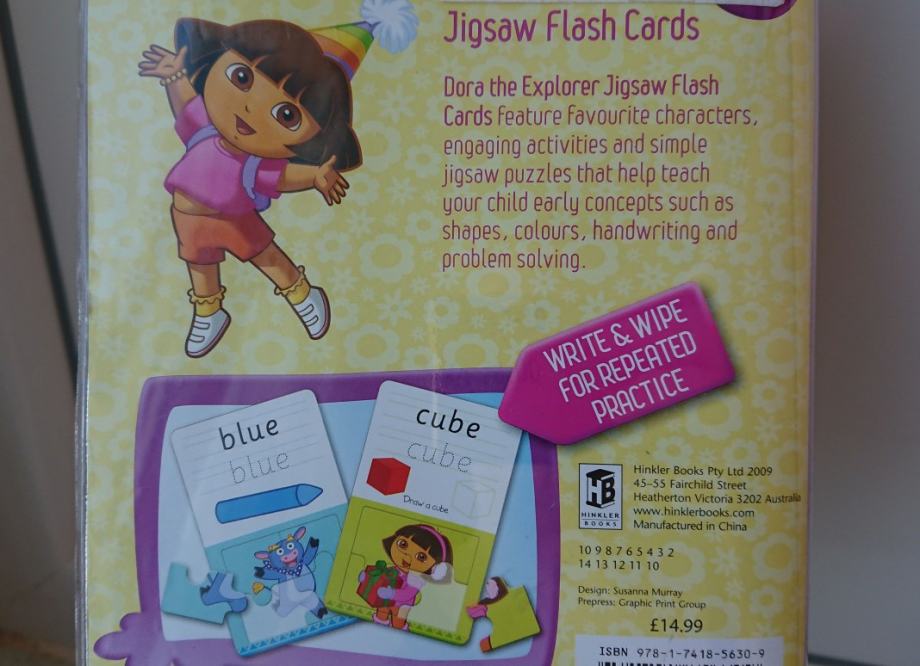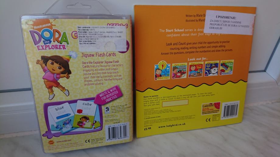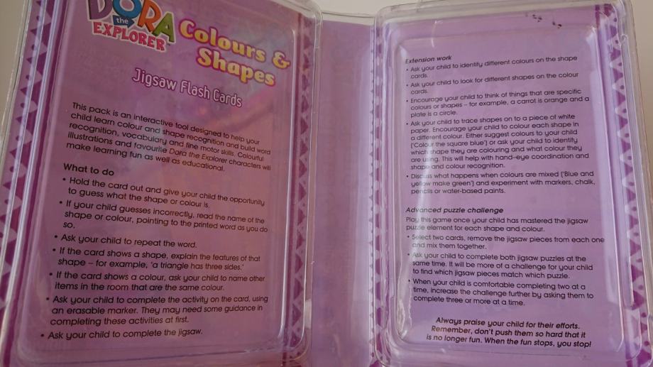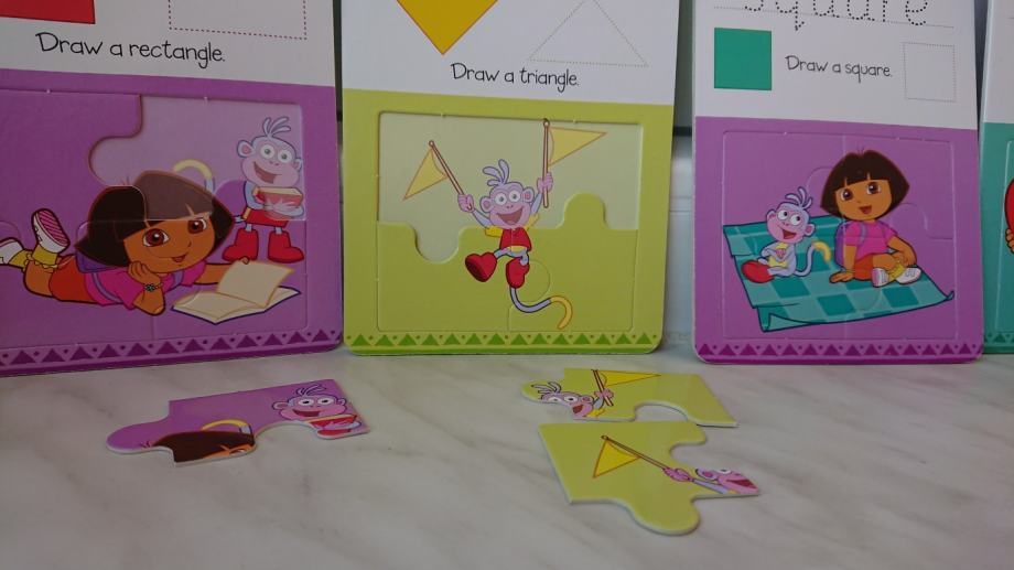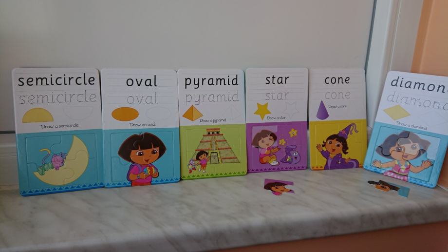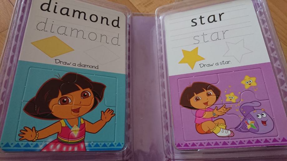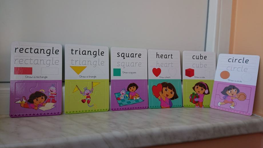 Dora istražuje paket za učenje na engleskom jeziku - geometrijski oblici, geometrijska tijela i boje, set sadrži 12 dvostranih kartica na kojima su 24 pojma (geometrijski oblici tj. tijela, ili boje), kao i 24 puzzle za slaganje raznih sličica iz poznatog crtića, kako bi djeci bilo zanimljivije učenje i pisanje.