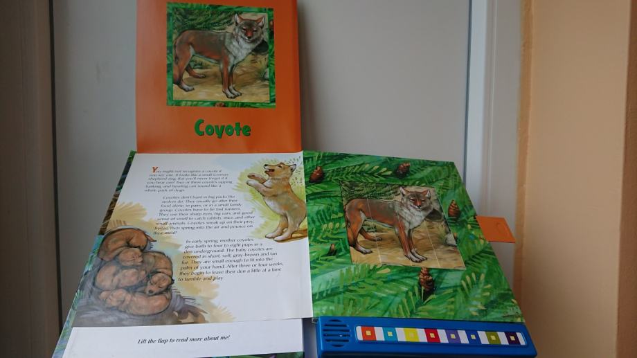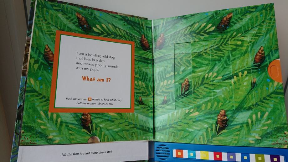 Nakon čitanja kratke zagonetke djeca trebaju pogoditi o kojoj se životinji radi, mogu (prema bojama na svakoj str.) stisnuti gumbiće na dnu da čuju kako se glasa, zatim povući udesno da se otvori prozorčić i vidi životinja, te mogu i dignuti stranicu sa lijeve strane da vide detaljnije informacije o životinji, mladuncima, okruženju gdje živi i ponašanju - na engleskom jeziku. Knjiga je vrlo zabavna, interaktivna.