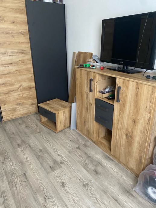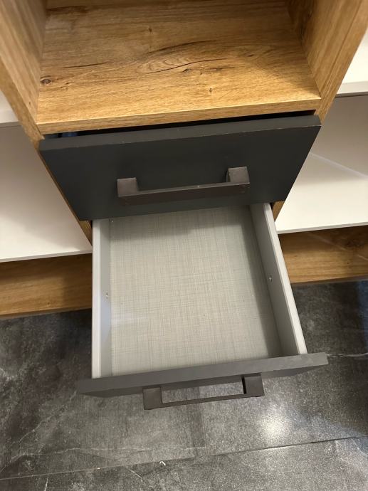 Ima dva velika ormarića, dvije ladice i otvorene police za odlaganje.