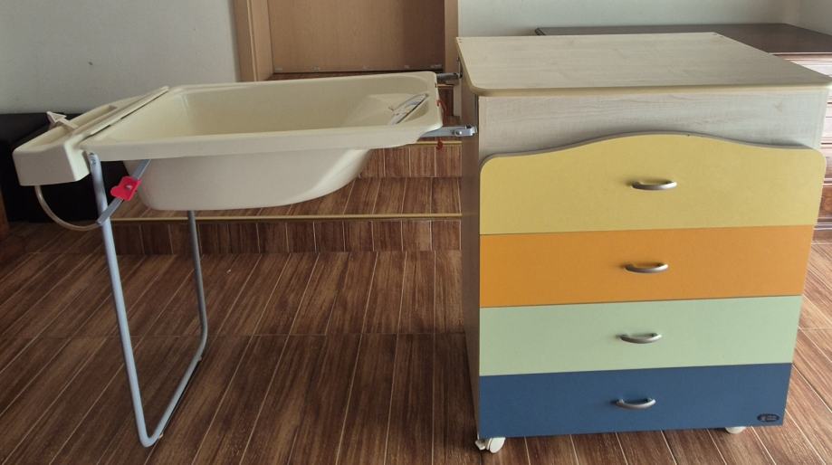 Prodajem čvrstu i kvalitetnu komodu za previjanje Primi sogni s sklopivim nosačem i kadicom te dodacima za jednostavno kupanje.