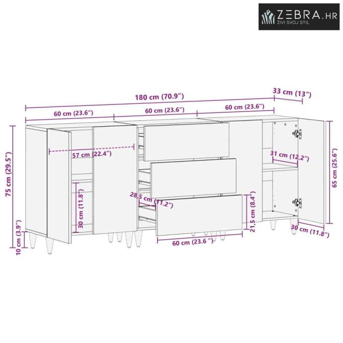 Svestrane primjene: Dimenzije 60 x 33,5 x 75 cm čine je prilagodljivom za razne prostore. Idealna je za pohranu blagovaonskog pribora, medijske opreme u dnevnoj sobi ili čak posteljine u spavaćoj sobi, nudeći funkcionalnu eleganciju svugdje. Njen dizajn pomaže održati prostor urednim i stiliziranim.
