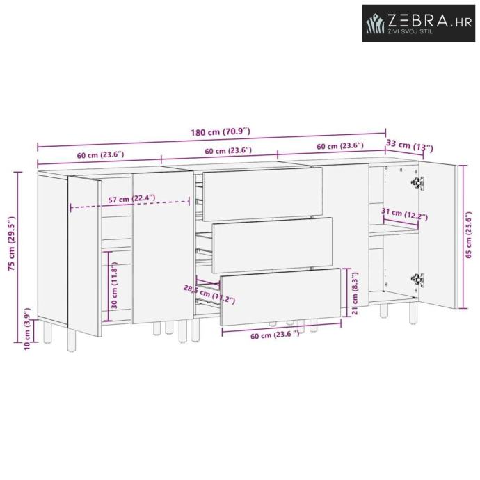Suvremeni dizajn: Sideboard ima elegantan pravokutni oblik s čistim linijama i savršeno se uklapa u moderne i minimalističke interijere. Njegova jednostavnost omogućava mu da se kombinira s različitim stilovima ukrašavanja, od modernih do prijelaznih, predstavljajući vrlo svestran dodatak vašem prostoru. Uklanjanje nepotrebnih detalja usmjerava pažnju na kvalitetu materijala i izvođenja.