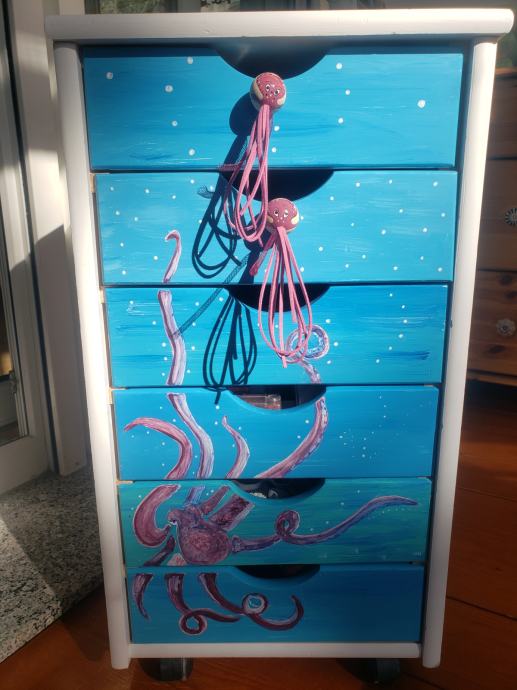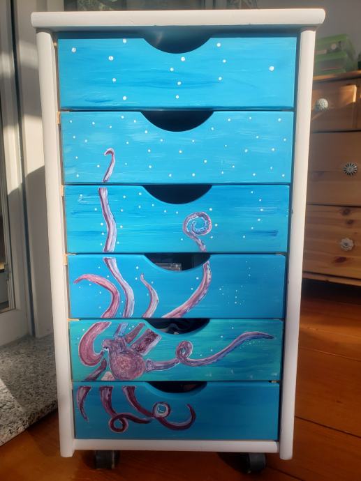Oslikani ladicar na kotacima dimenzije: dubina 40, širina 34, visina 64. Optimalno rjesenje za pohranu lego kockica ili sitnih igracaka a moze i kao dodatak radnom stolu za pohranu skolskog pribora.
