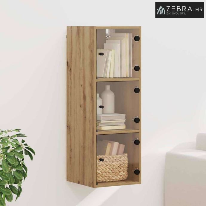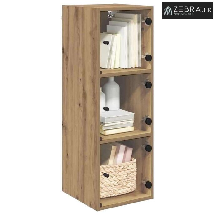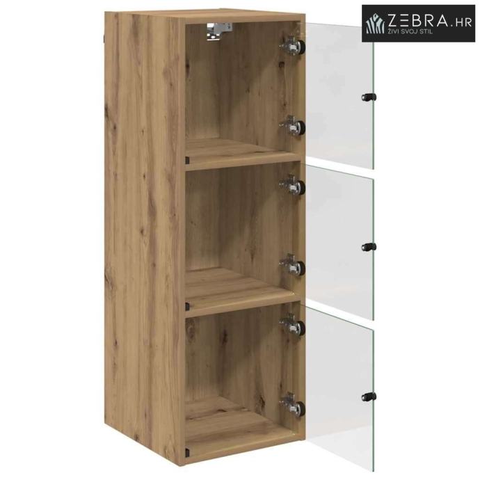 Materijali: Ovaj ormar izrađen je od visokokvalitetnog konstruiranog drveta, što osigurava čvrstinu koja podnosi svakodnevno korištenje. Njegova glatka površina dodaje modernu notu i olakšava održavanje. Uključene komponente: Zbog prozirnih polica i staklenih vrata, lako možete vidjeti što sve imate unutra. Kompaktni spojevi vrata osiguravaju dobru funkcionalnost i privlačan vizualni dojam. Komponente za montiranje su prilagodljive, tako da možete prilagoditi kako vam najbolje odgovara. Karakteristike / Funkcija / Dizajn: Montiranje na zid omogućuje vam da iskoristite prostor, dok je ormar siguran i stabilan. Pravokutni oblik pomaže u organizaciji prostora nudeći dovoljno mjesta za stvari, savršeno se uklapa u moderni stil interijera. Preporučene upotrebe: Idealan za dnevne sobe, radne prostore ili kućne urede. Pomaže u organizaciji prostora i dodaje dekorativnu notu, savršeno za male prostore. Njega i održavanje: Održavajte ga uz redovito brisanje suhom krpom i izbjegavajte jake kemikalije koje bi mogle oštetiti drvo i staklo. Ova rutina održava njegov izgled kroz godine. Boja: Umjetnički hrast