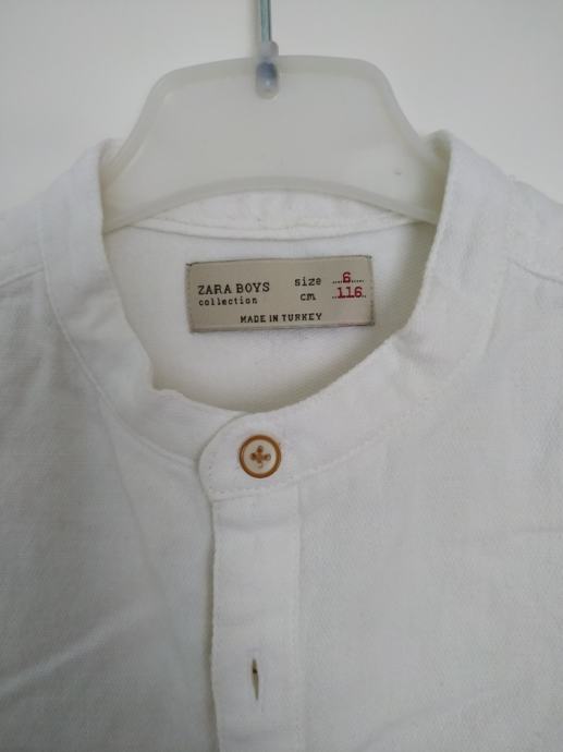 Bijela košulja za dječake ZARA, vel. 116 (6 godina). Kopčanje cijelom dužinom i dva prednja džepa. Okrugla (ruska) kragna. Dodatni gumbi na rukavima koji omogućavaju da se nosi podvrnutih rukava kao 3/4 dužina ili kao kratki rukav. Vrlo malo nošena i u odličnom stanju.