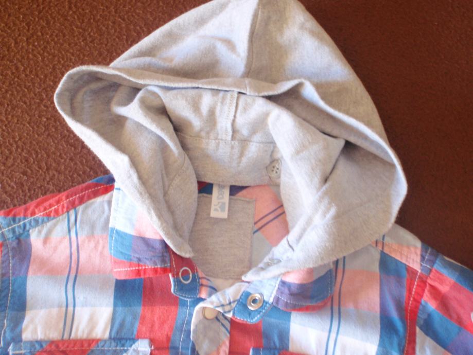 Dječja košulja branda IDEXE. Veličina 104 (3/4). Materijal 100% pamuk. Karirana košulja kratkih rukava sa rukavima sive boje. Kapuljaču je moguće skinuti. Kopčanje na drukere. Košulja jako dobro očuvana, bez flekica i oštećenja. Pogledajte moje ostale oglase.