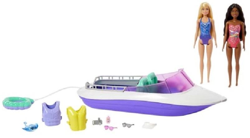 Kids can join Barbie® 'Malibu' Roberts and Barbie® 'Brooklyn' Roberts dolls on their most magical adventure yet with this Barbie Mermaid Power™ playset featuring an 18-inch boat that can float in water! Kids can seat up to four dolls in the boat, look through the 'glass' bottom to explore the deep sea or go for a ride in the attached raft! Both Barbie® 'Malibu' and Barbie® 'Brooklyn' Roberts dolls are dressed for adventure in colorful swimsuits, and storytelling accessories expand play. With Barbie Mermaid Power™ dolls and playsets, kids ages 3 years old and up can recreate their favorite moments or dream up tales of their own! Each sold separately, subject to availability. Dolls cannot swim or stand alone. Colors and decorations may vary.Dive into storytelling adventures with Barbie® 'Malibu' Roberts doll, Barbie® 'Brooklyn' Roberts doll and a boat that can really float!Inspired by Barbie Mermaid Power™, the 18-inch speedboat features a sleek design and seating for 4 dolls.The dolls can peer through the 'glass' bottom to explore the deep sea or go for a ride in a raft that attaches to the back of the boat!Spark storytelling play with accessories including an adorable baby stingray, 2 life vests, 2 pairs of sunglasses, a visor, camera and bottle of sunblock.Barbie® 'Malibu' and Barbie® 'Brooklyn' Roberts dolls are ready for any adventure in mermaid-inspired bathing suit