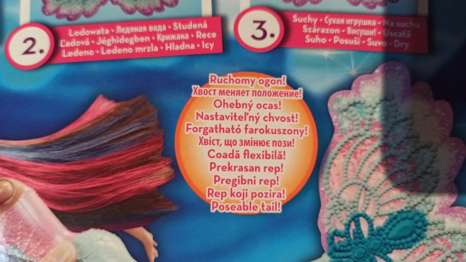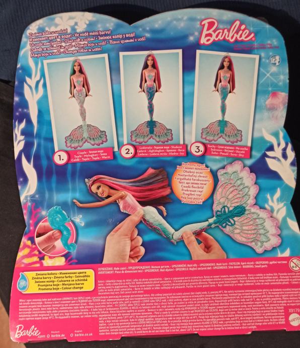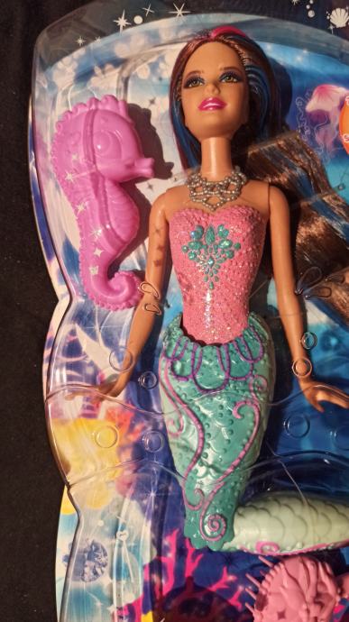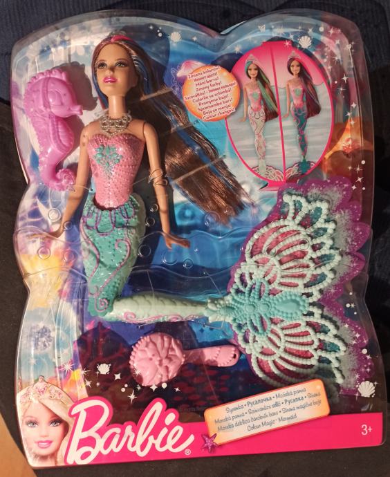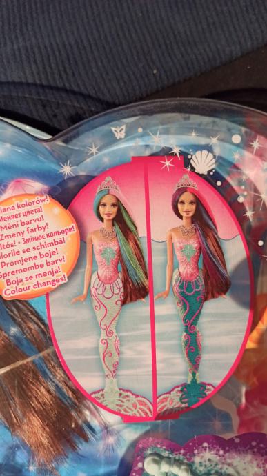 Prodajem novu, nekorištenu i originalno zapakiranu Matell Barbie Colour Magic Mermaid Teresa (Sirena magične boje). Sve je u savršenom stanju iako datira iz 2013.g. Kosa i rep mijenjaju boju u toploj/hladnoj vodi. Rep je pokretan/pregiban. U kompletu dolazi lutka, češalj, tijara, ogrlica i vodeni konjić koji iz usta šprica vodu. Ova Barbie se više ne može nabaviti na slobodnom tržištu već samo na amazonu i ebay-u te sad već spada u raritete i kolekcionarske primjerke. Stanje se najbolje vidi na priloženim slikama i videu.