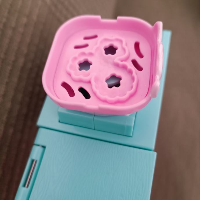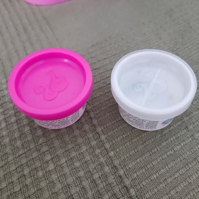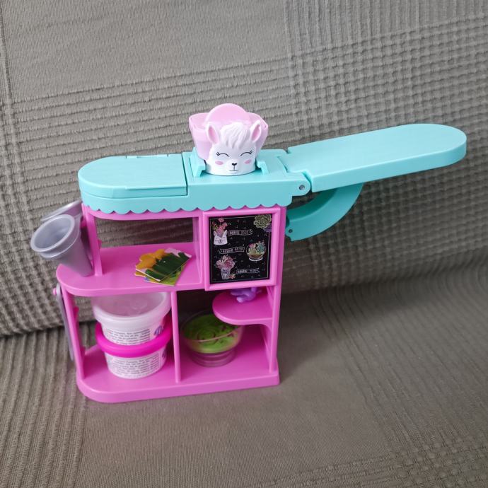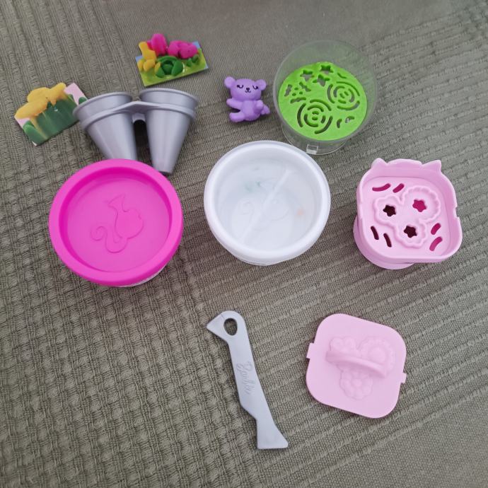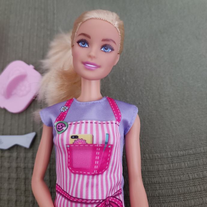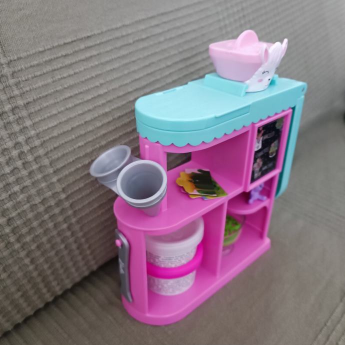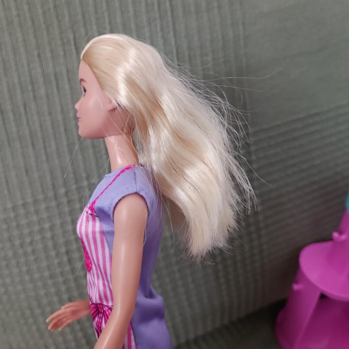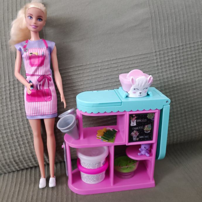 Očuvan set. Barbie je kosa od repa ostala kao što se vidi na slici, ali je i dalje svilena i mekana i moze se češljati. U setu nema gline, ali možete dodati u kutijice bilo koji glinu. Set je inače kompletan sa svim dodacima i Barbie lutkom koja dolazi uz njega.Pogledajte ormar.