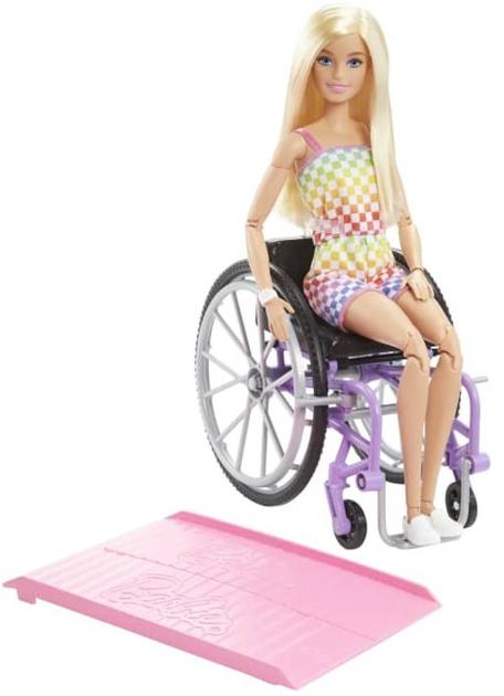 Barbie® Fashionistas™ celebrate diversity and offer endless possibilities for storytelling and fashion exploration. With this inclusive range of dolls, kids can see how fun it is to express personality through style! They're an ideal gift for fashion-loving kids everywhere. Each sold separately, subject to availability. Dolls cannot stand alone. Colors and decorations may vary.Designed to reflect the world kids see today, this diverse line of Barbie® Fashionistas™ showcases bright and trendy styles that make for endless storytelling possibilities.Barbie® doll sparks play potential with a manual purple wheelchair and a pink ramp that help her get easily in and out of the Barbie® Dreamhouse™ (sold separately, subject to availability).It's all about movement! This stylish doll has 22 articulation points for multiple posing and play options.She has straight blonde hair and wears a fun rainbow-checkered romper with a pink watch accessory and white sneakers.More variety makes collecting Barbie® Fashionistas™ dolls even more fun -- they're the perfect gift for kids 3 years and older! (Each sold separately, subject to availability).