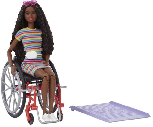 Barbie® and Ken™ Fashionistas™ celebrate diversity with fashion dolls that encourage real-world storytelling and open-ended dreams! With a wide variety of skin tones, eye colors, hair colors and textures, body types and fashions, the dolls are designed to reflect the world kids see today. Barbie® doll inspires new play possibilities with a manual wheelchair and ramp so she can easily get in and out of the Barbie® Dreamhouse™ (sold separately, subject to availability). Kids can collect them for infinite ways to play out stories, express their own style and discover that fashion is fun for everyone! Includes doll wearing fashions and accessories. Each sold separately, subject to availability. Barbie® dolls cannot stand alone. Flat shoes fit dolls with articulated ankles or flat feet. Colors and decorations may vary.The latest line of Barbie® Fashionistas™ dolls includes different body types and a mix of skin tones, eye colors, hair colors, hairstyles and so many fashions inspired by the latest trends!Barbie® doll comes with a wheelchair that has rolling wheels and a working brake, plus a ramp that works with the Barbie® Dreamhouse™ (sold separately).The doll also features 22 'joints' -- in the neck, upper arms, elbows, wrists, torso, hips, upper legs, knees and ankles -- to play out all kinds of motion in and out of the wheelchair.She wears a rainbow-striped dress with white sneakers, a white fanny pack and pink heart-shaped sunglasses.Her long brunette hair is crimped for a trendy look.