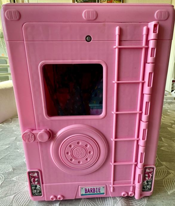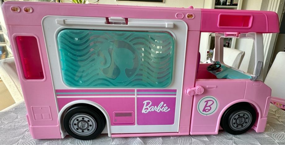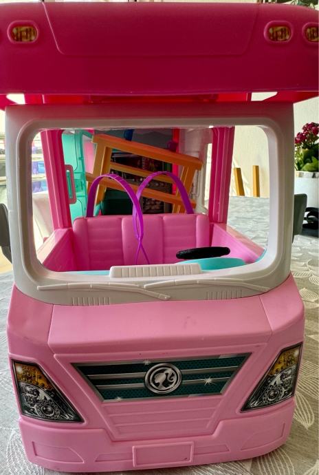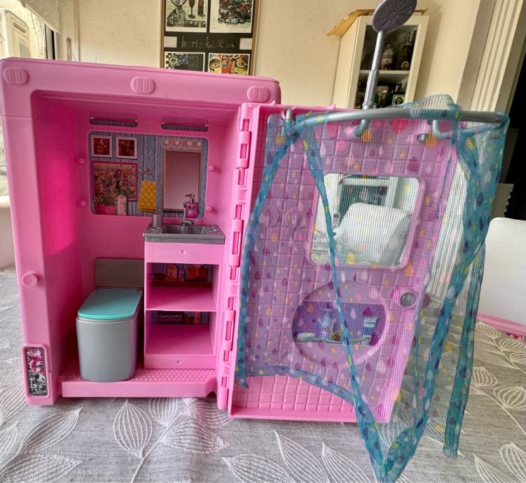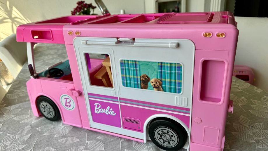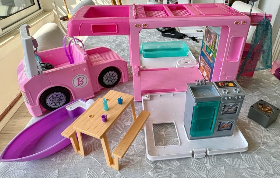 Barbie kamper 3u1 u izvrsnom stanju, dolazi s dodacima s fotografije. Ceka novu vlasnicu :) ima bazen, gornji dio podize se u krevet na kat, ima gliser, klupu, stednjak, sudoper, kupaonicu s tusem, rostilj.