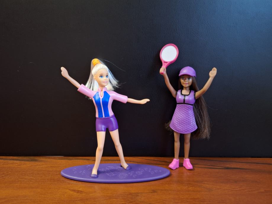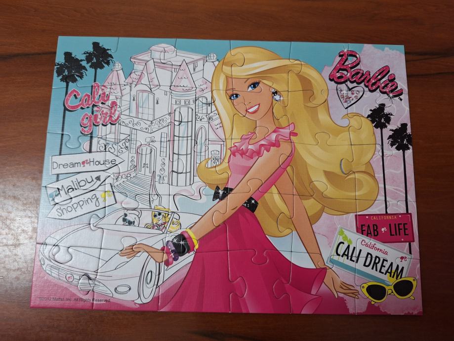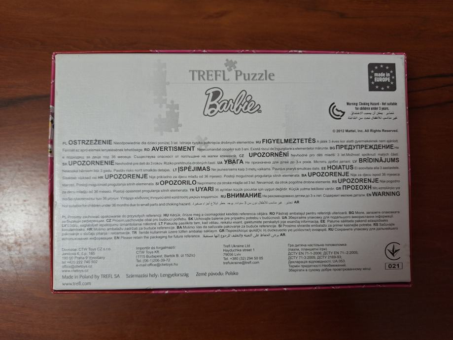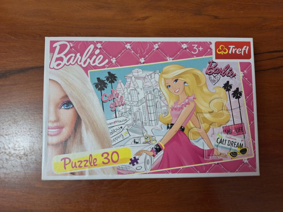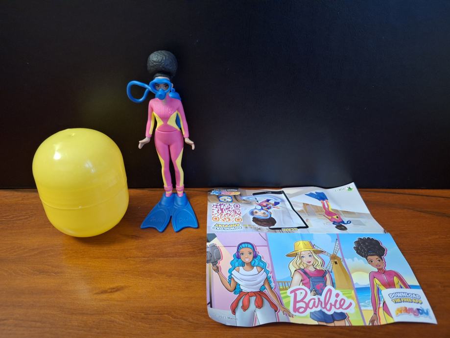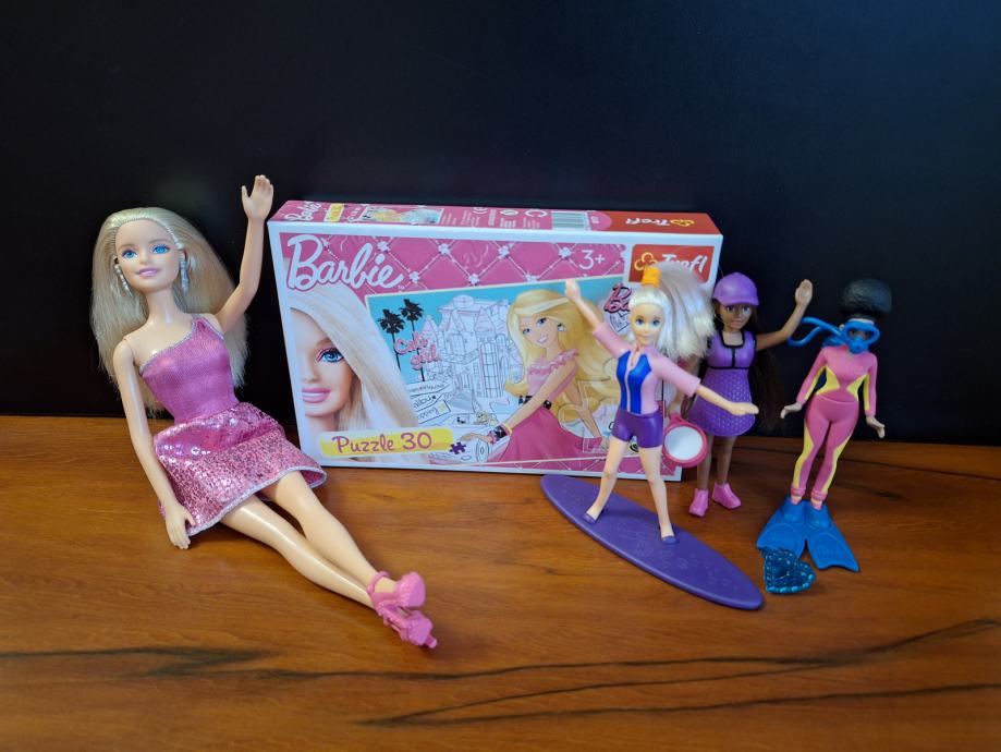 U setu dolaze: velika Barbie lutka (s haljinom, cipelama i naušnicama), Barbie puzzle (trefl), dvije male Barbie lutkice (surferica i tenisačica), prsten i još jedna Barbie figurica.