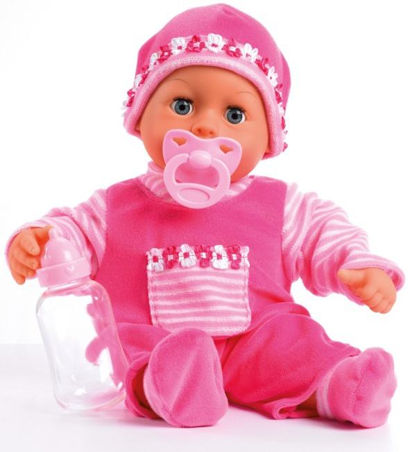 First Words Baby is a 38 cm soft-bodied doll with sleeping eyes and 24 functions. When you press her tummy she laughs, cries or makes different baby sounds. A pacifier and a bottle are included in the set. Delivered in a beautiful showbox, batteries included.