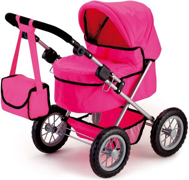 Trendy is a beautiful doll's pram, in fashionable colours and is suitable for dolls up to 46 cm. With its adjustable handle, this pram is already suitable for the smallest girls, and will grow with them. With its four big wheels it is suitable also for uneven grounds. Furthermore the pram can be folded up quickly for transportation. Conveniently, the integrated shopping basket can store everything, which is needed for a trip with the doll's mum and her little darling. Handle height (cm): 39-68, Measurements (cm): 67 x 41 x 68