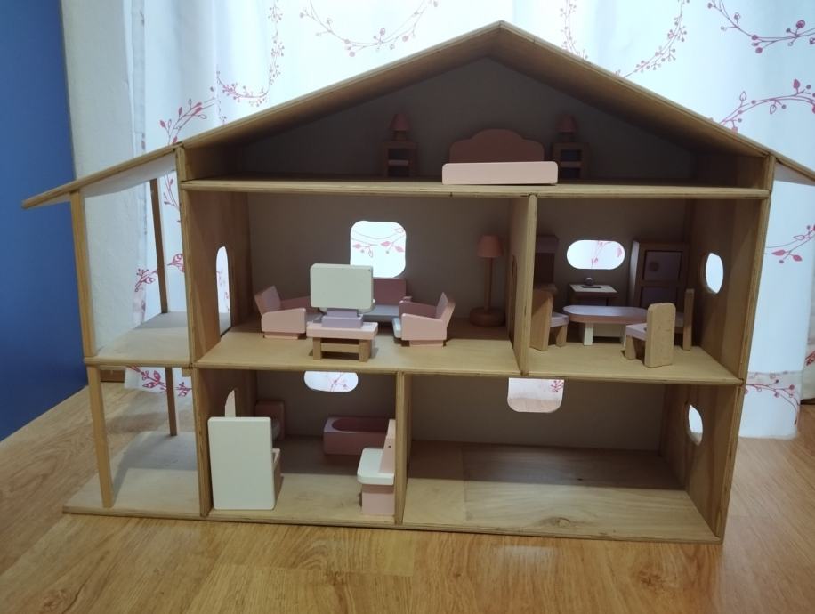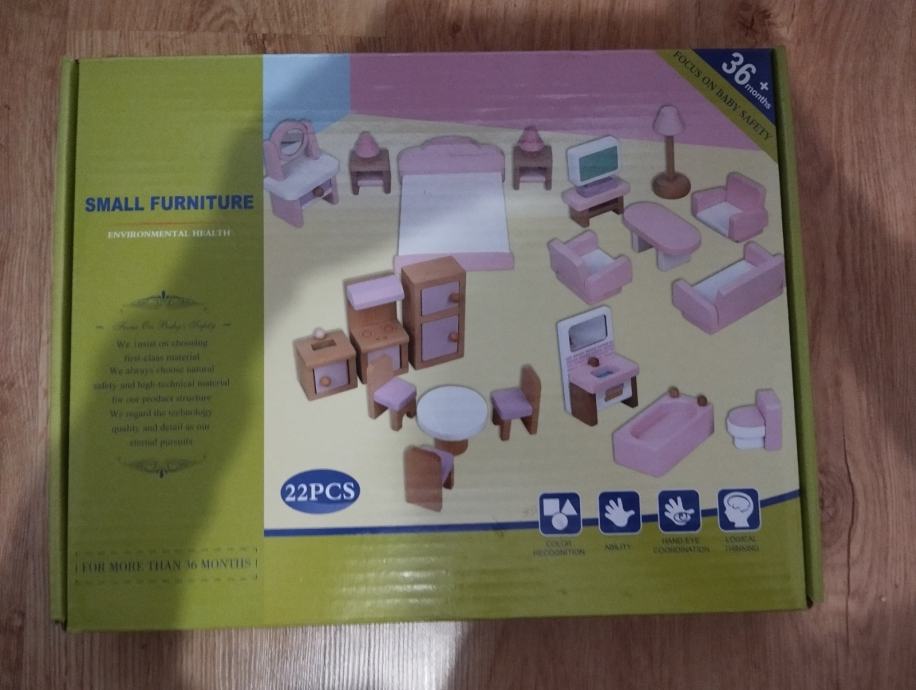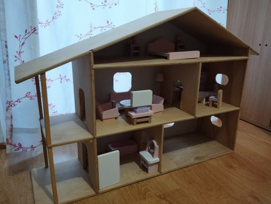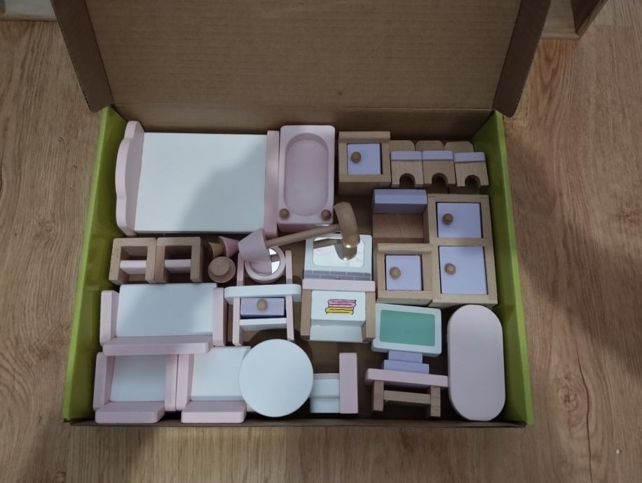 Set drvenog namještaja s kojim dijete možete opremiti svaku prostoriju - kuhinju, dnevni boravak, spavaću sobu, kupaonicu. Elementi se mogu otvarati.