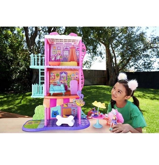 Live sky high at this Enchantimals™ City Tails™ apartment playset! At 28-inches tall with 6 play areas, it's bustling with storytelling fun. Also included are Palmer Pomeranian™ doll (6-in) and her pup, Pommy™! There are 3 floors -- a café downstairs with outdoor patio seating, a living room and kitchen, the bedroom, plus a rooftop with a "pool." This colorful playset also has a balcony, fire escape stairs, and a door that opens (with a puppy door for Pommy™, too). These Pomeranian pups love to invite other Enchantimals™ friends to their town house. It's the perfect place to hang in the city! With accessories like a bed, couch, fridge that opens, drinks, desserts, and more -- kids have everything they need to help these Enchantimals™ friends live their best city lives! Colors and decorations may vary.Features:Live sky high at this Enchantimals™ City Tails™ apartment!At 28-inches tall with 6 play areas and 15+ pieces, this playset is bustling with storytelling fun.Also included are Palmer Pomeranian™ doll (6-in) and her roomie, Pommy™ pup.There are 3 floors: a café downstairs with an outdoor patio, a living room and kitchen, bedroom, plus a rooftop "pool" area. The apartment exterior is pawsitively adorable with a balcony, fire escape stairs, and door that opens (with a puppy door for Pommy™, too).With accessories like a bed, couch, fridge, drinks, desserts, and more -- kids have everything they need to help these Enchantimals™ friends live their best city lives!Great gift for kids ages 4 years old and up, encourages imaginative play. Enchantimals™ Town House Café Playset (28-in) with Doll, Dog, & AccessoriesIncludes 1 apartment playset (28-in), 1 doll (6-in) wearing removable fashions and accessories, 1 animal figure, and 19 accessories