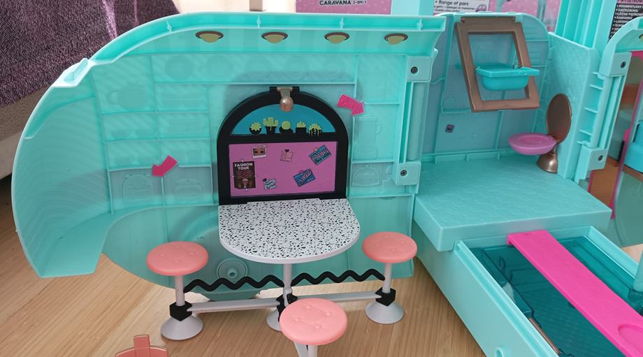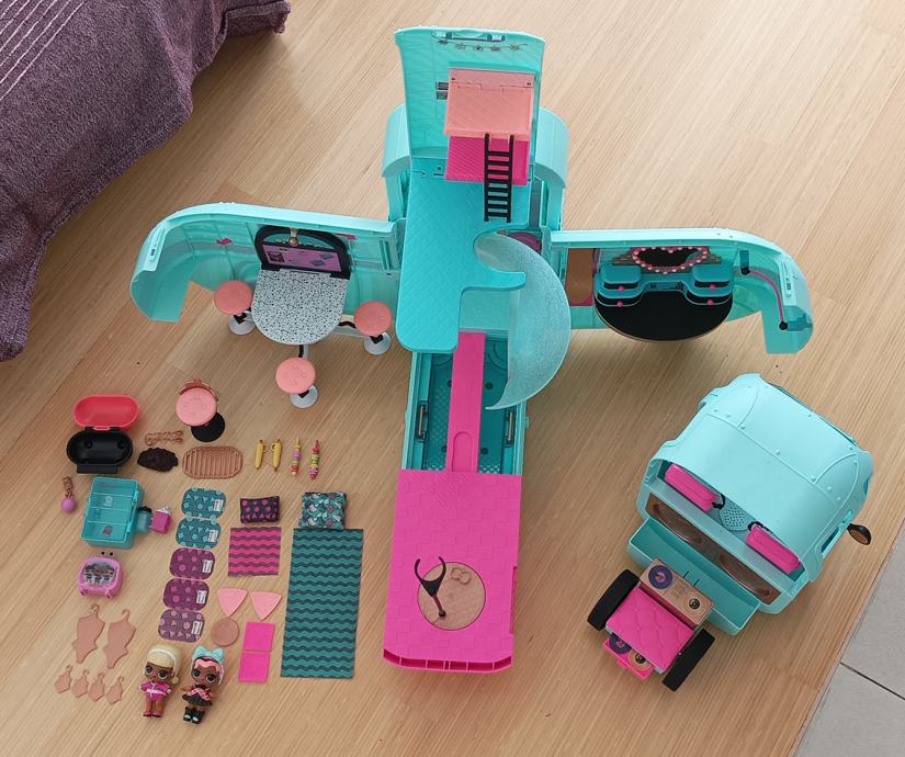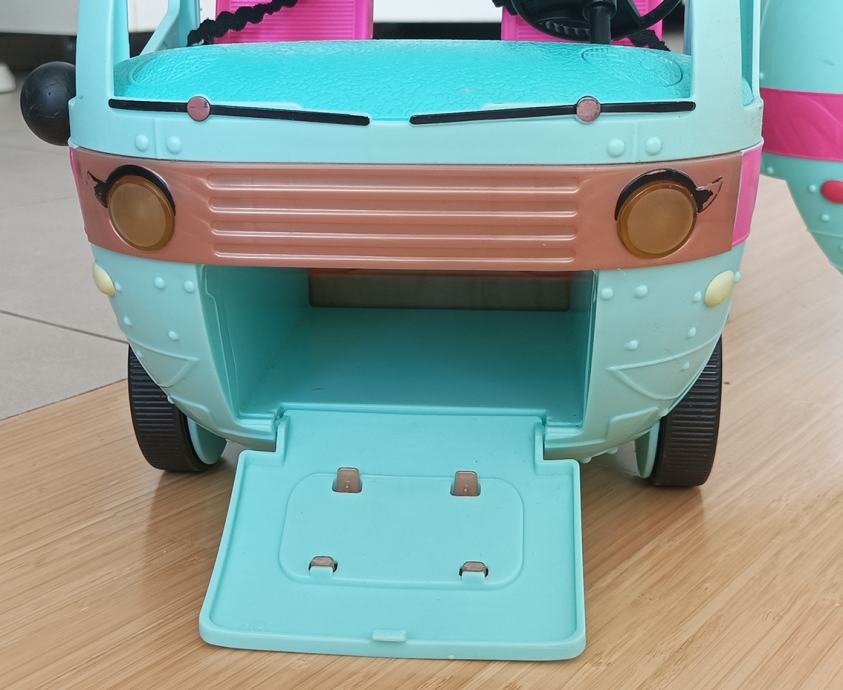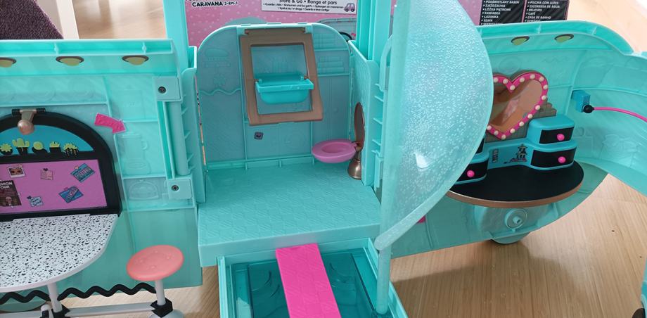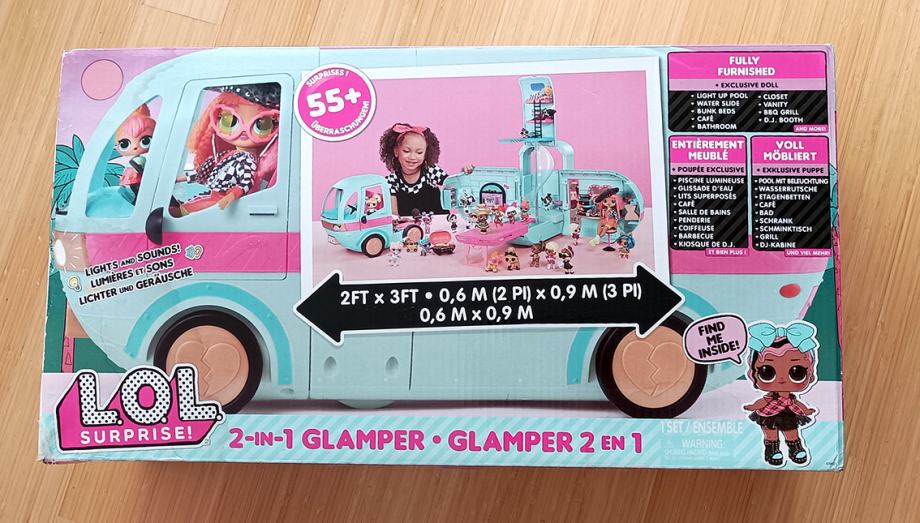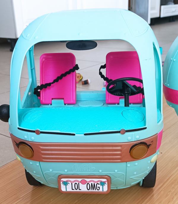 LOL Gamper je kad se pojavio proglašen jednom od 5 najboljih igračaka godine, neke igračke na listi su koštale i preko 500 dolara. Novi model kampera košta oko 1500 kuna. Naš prodajemo za 550 kuna. Kamper ima osvjetljeni bazen sa toboganom, modnu pistu, DJ set, roštilj, garderobu, kupaonu.... Kamper je u vrlo dobrom stanju, jedina su oštećenja na jednom retrovizoru te je desna ruke lutkice također oštećena (molim pogledati na fotografijama). Nedostaje jedan retrovizor. Zbog toga smo dodali još jednu LOL lutkicu koja je koštala 150 kuna.