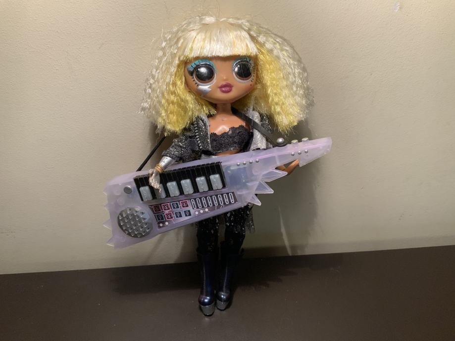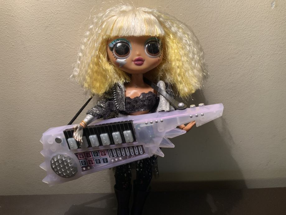 Prodajem LOL surprise OMG Remix Rock Fame Queen lutku sa keytarom. Keytar ima baterije i svira 6 melodija. Lutka je visine 25 cm.
