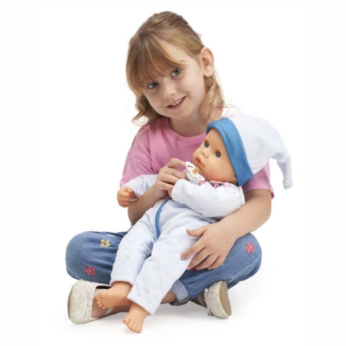 Lutka dojenče u plavoj pidžami visoka je 48 cm i dolazi s dodacima poput dude.