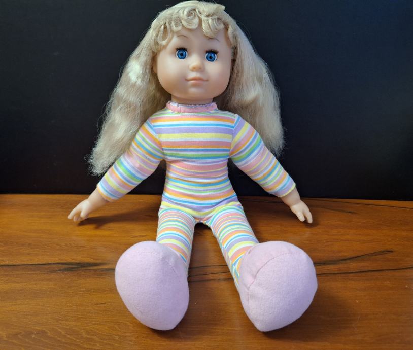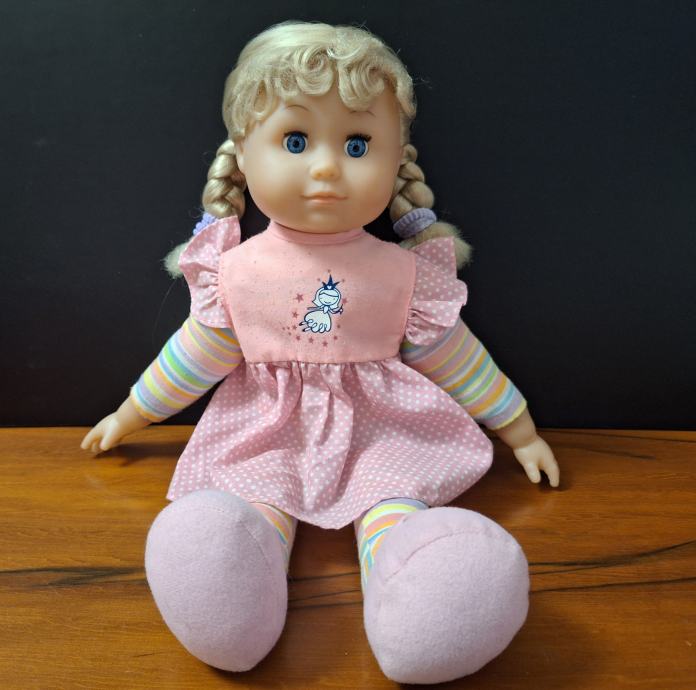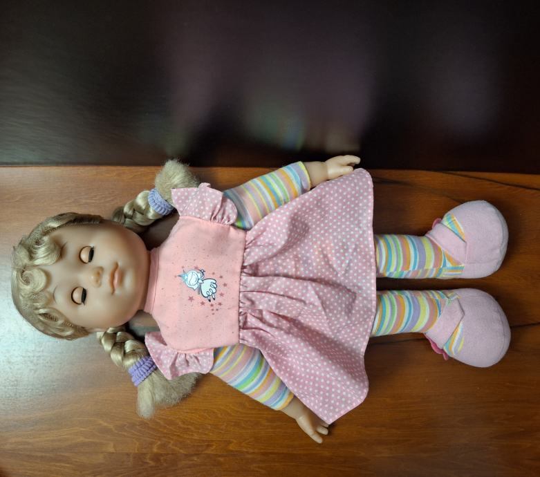 Lutka je u dobrom stanju i dolazi uz vlastitu nosiljku haljinu i s kosom u pletenicama.