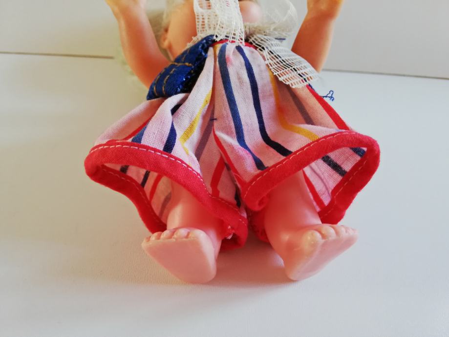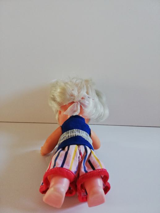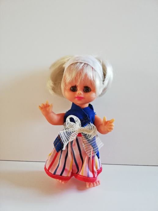 Lutka je visine 20 cm, plava kosa, pomične ruke i noge, sklapa oči, suknja - hlače na crte, plava bluza - 50 kn