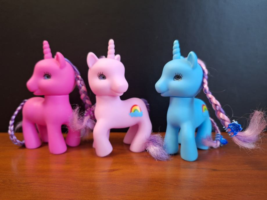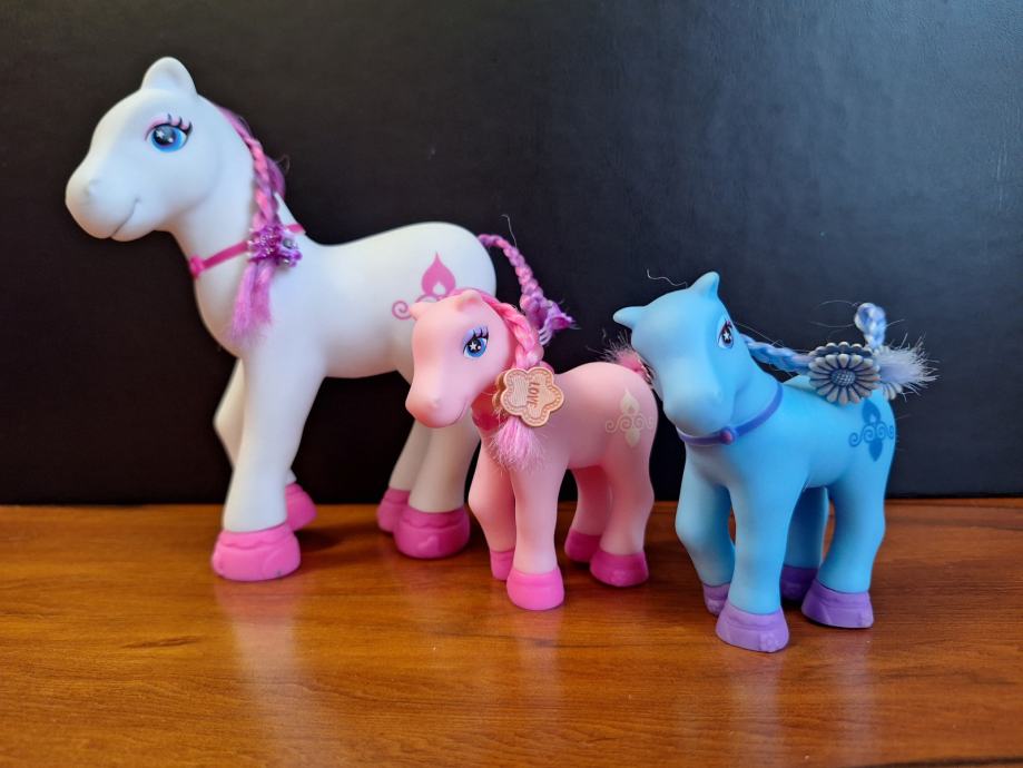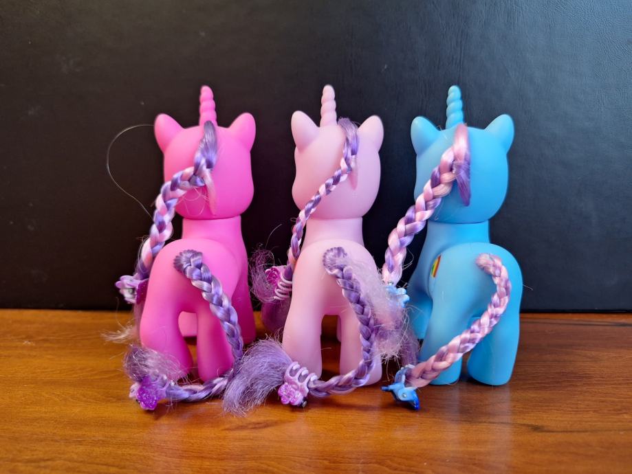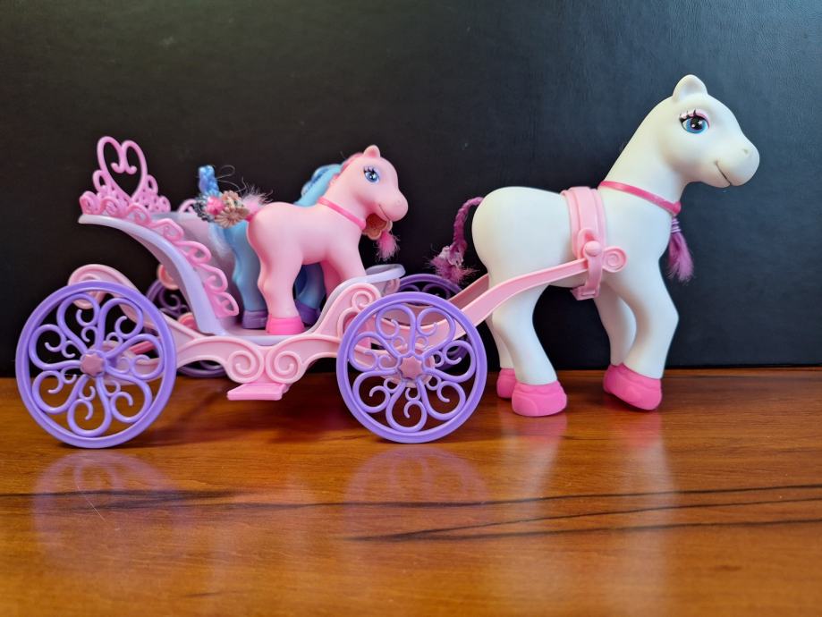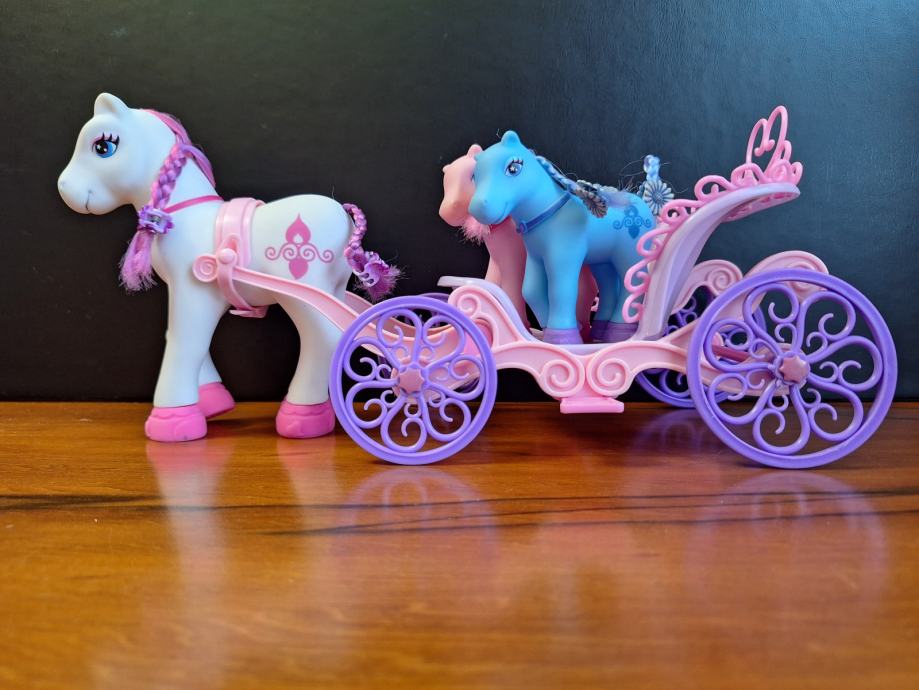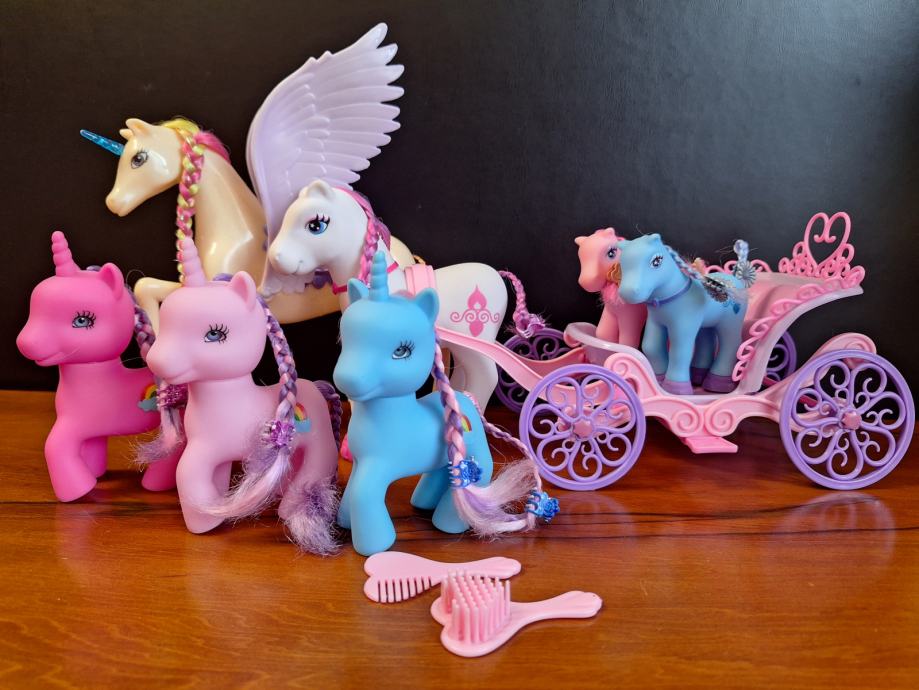 U setu dolaze: kočija, veliki bijeli poni, 2 mala ponija (plavi, rozi), 2 češljića, veliki krilati jednorog, 3 raznobojna jednoroga.