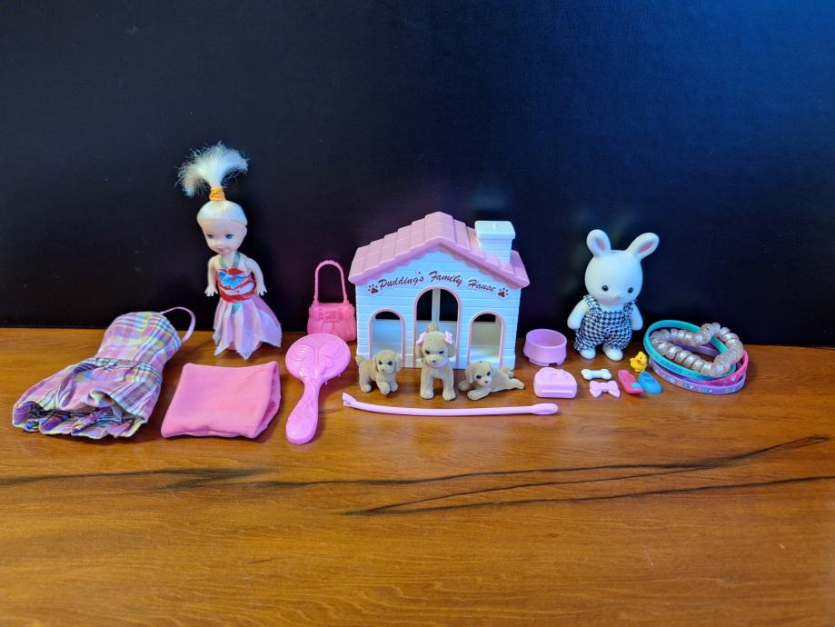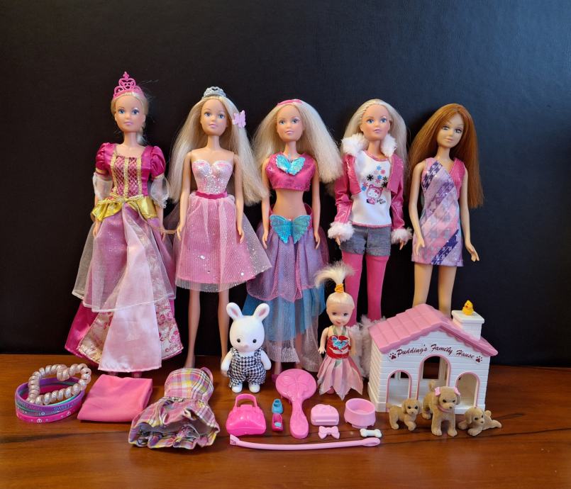 U setu dolaze: 4 Steffi lutke i još dvije druge (mala i velika) koje dolaze uz svoju originalnu odjeću, zečića, 3 psića, pseću kućicu, dodatnu osjeću… (sve sa slika)