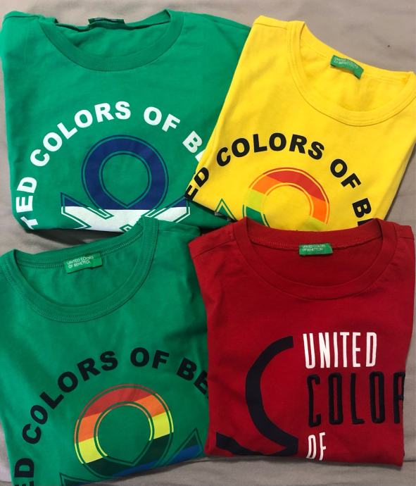 Benneton majice kratkih rukava (2 zelene, crvena i žuta boja). Veličina 160 cm (2xl). Majice su potpuno očuvane, a 2 nisu nikad nošene. Cijena 30 eura uvećano za troškove slanja. Moguća primopredaja na području Zagreba.